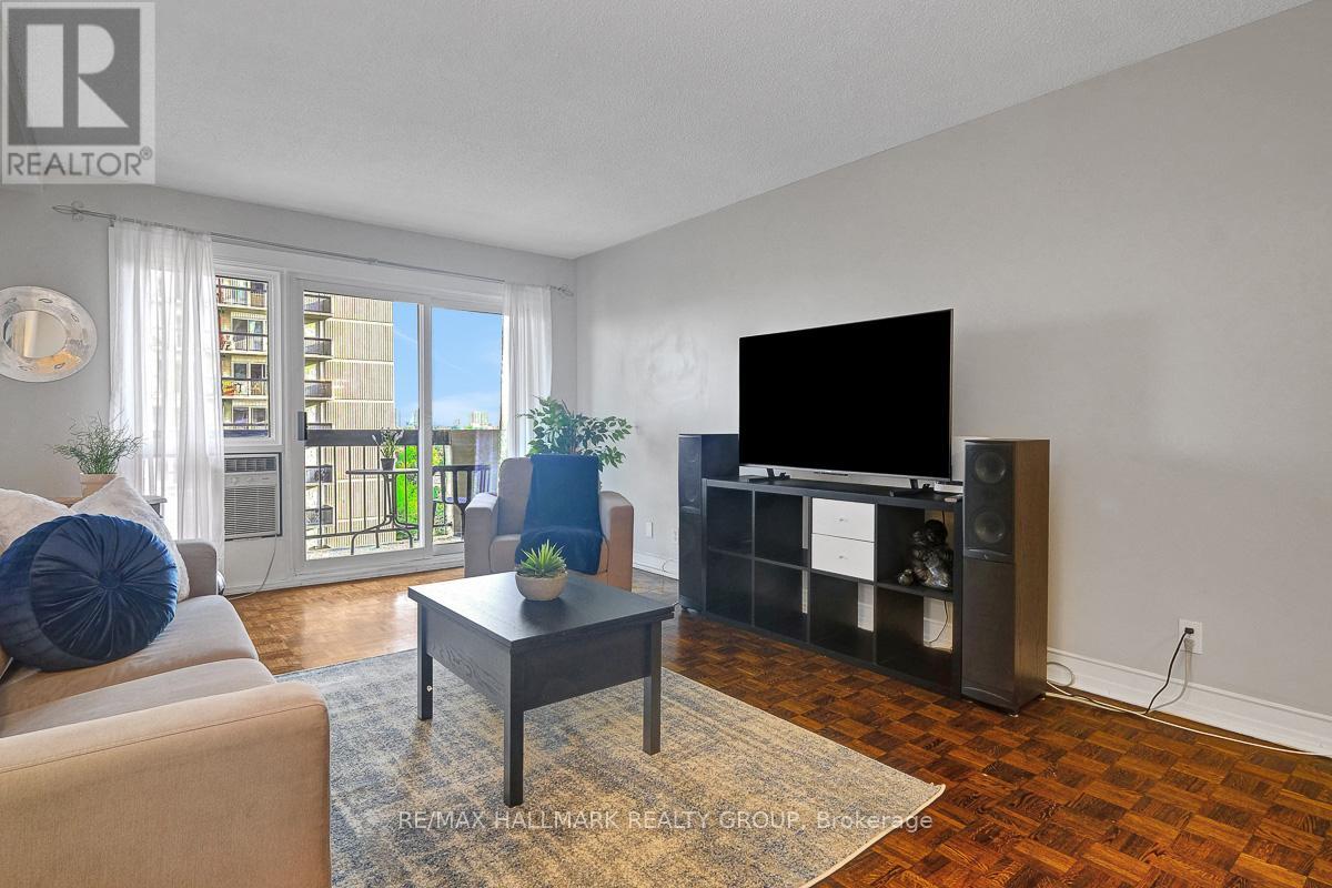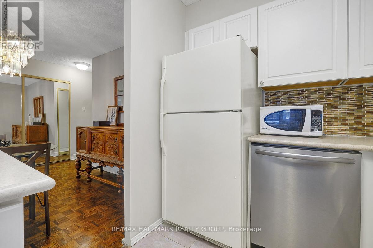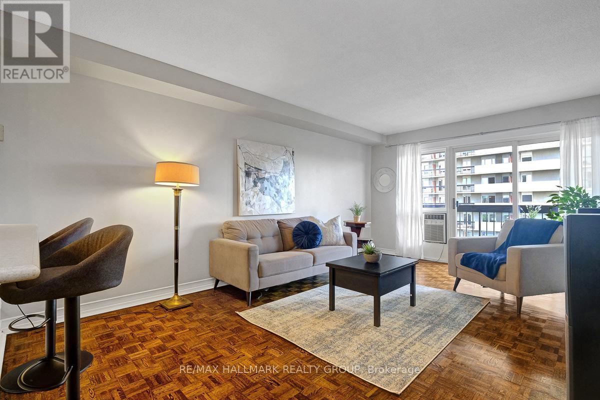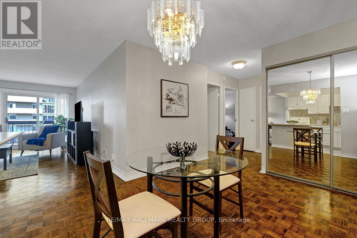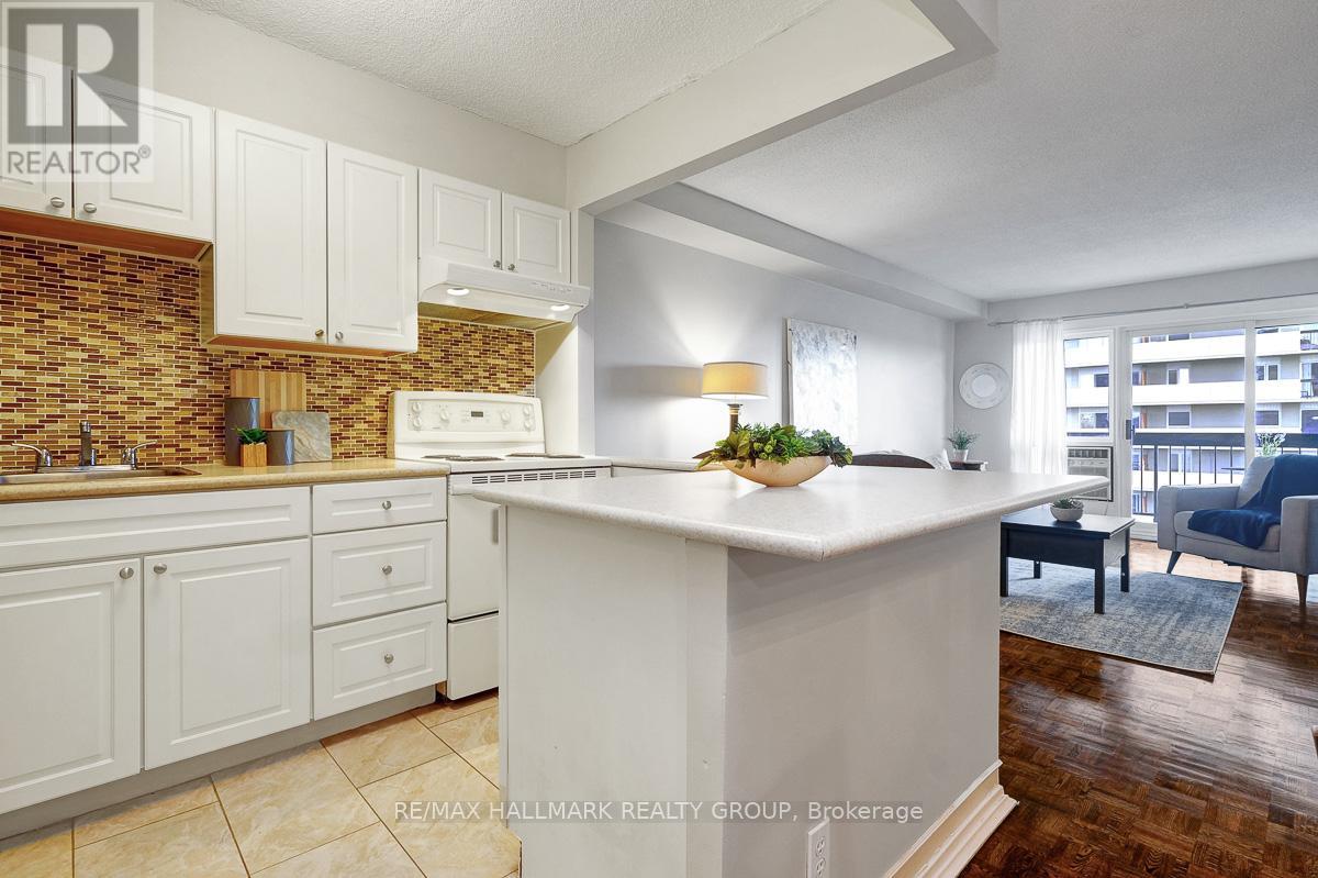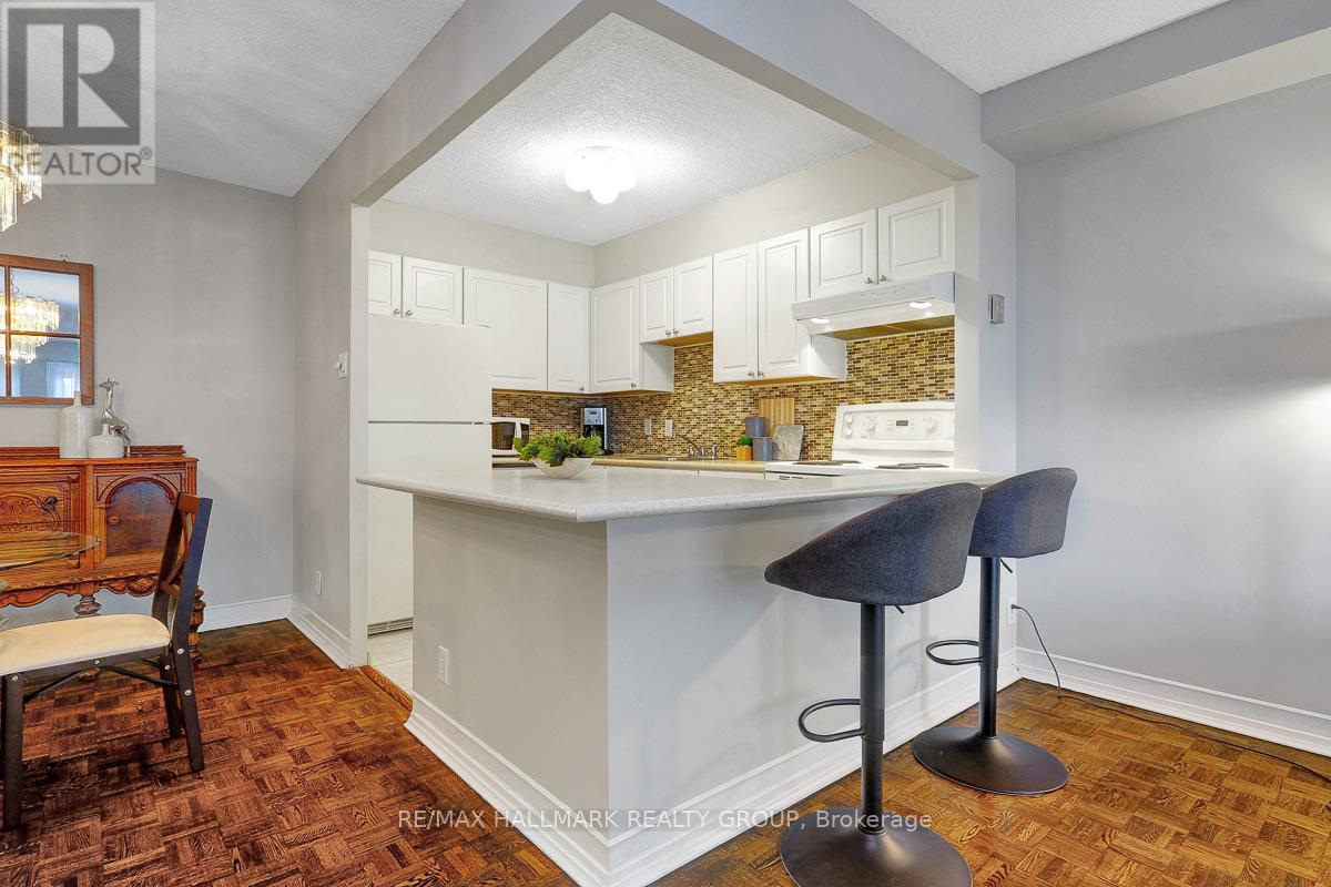 Welcome to Chateau Vanier, a well-managed condo community offering resort-style amenities just minutes from downtown. This bright and freshly painted 2 bedroom, 1 bathroom unit on the 10th floor makes a strong first impression with sunset views, city skyline glimpses, and a rare 30-foot balcony - a peaceful outdoor space to enjoy morning coffee or unwind in the evening. Inside, the layout is open and welcoming. The upgraded kitchen features classic white cabinets, glass tile backsplash, a breakfast bar, updated countertops, porcelain tile flooring, and plenty of storage. The open-concept living and dining areas have been freshly painted in a trendy modern wall tone by Benjamin Moore, complemented by refinished parquet hardwood flooring that brightens the entire space. Both bedrooms are great sizes, with generous closet space and large windows. The bathroom has been tastefully updated with a granite-topped vanity and a sleek, glass-enclosed shower. The entryway includes mirrored bi-fold closet doors, adding both storage and a sense of spaciousness. A large in-unit storage room offers excellent pantry, seasonal, or utility space - an added bonus not always found in comparable condos. This unit comes with 1 exclusive-use underground heated parking space. Residents enjoy access to top-tier amenities including a heated indoor saltwater pool, fitness centre, men's and women's saunas, library, party/meeting rooms, indoor car wash bay, EV charging stations, bike storage, workshop, and beautifully landscaped grounds. The community is quiet and friendly, appealing to professionals, retirees, and downsizers alike. Located near public transit, the Rideau River, Riverain Park, the Rideau Tennis Club, and grocery options like Loblaws, FreshCo, and Green Fresh Market. You're just minutes from downtown, the University of Ottawa, and the future Montreal Road revitalization. A perfect mix of lifestyle and locationthis is condo living made easy. (id:31145)