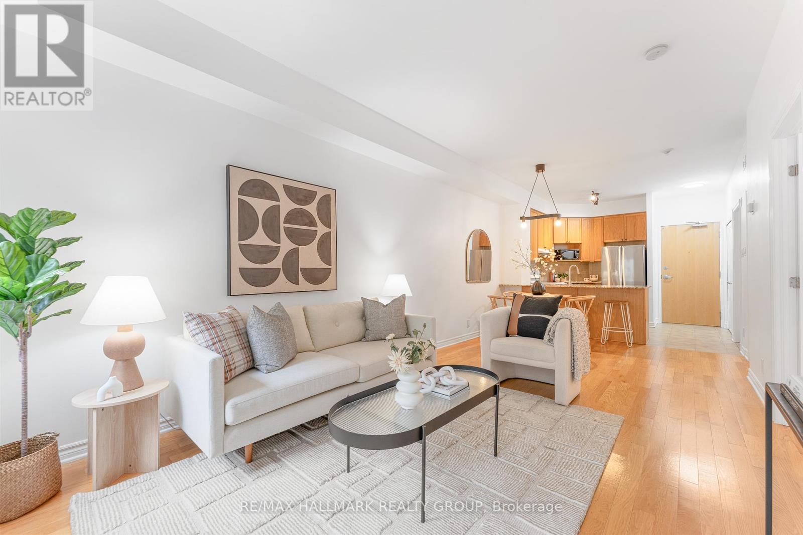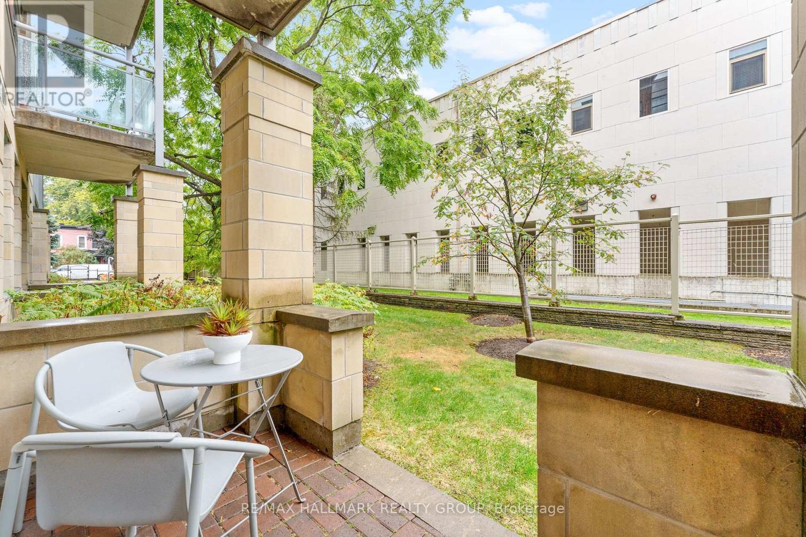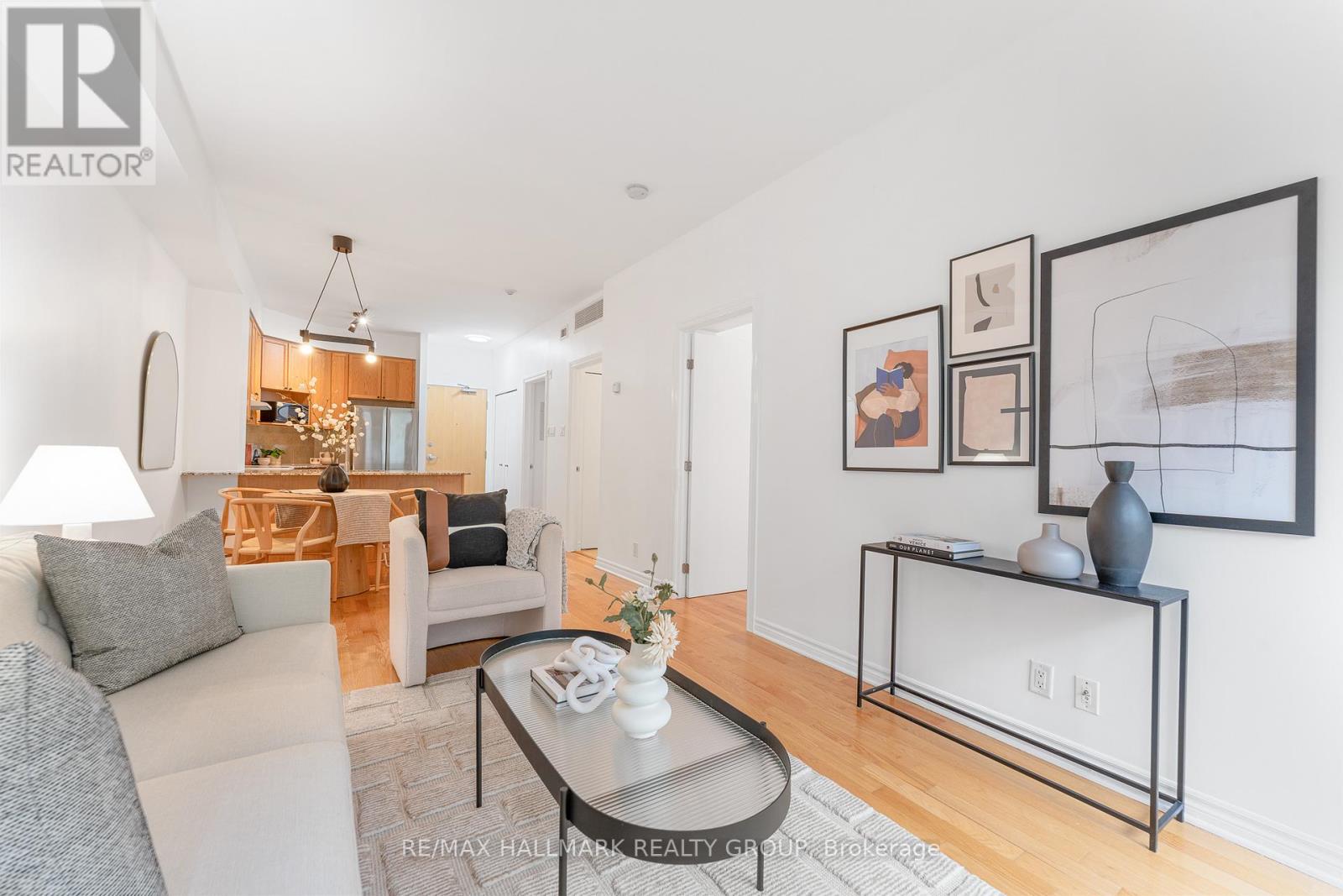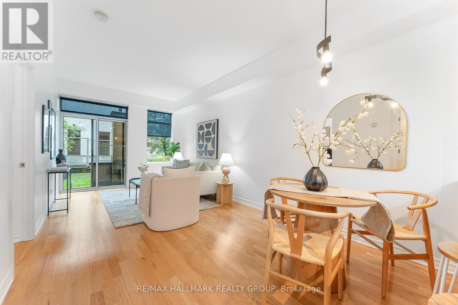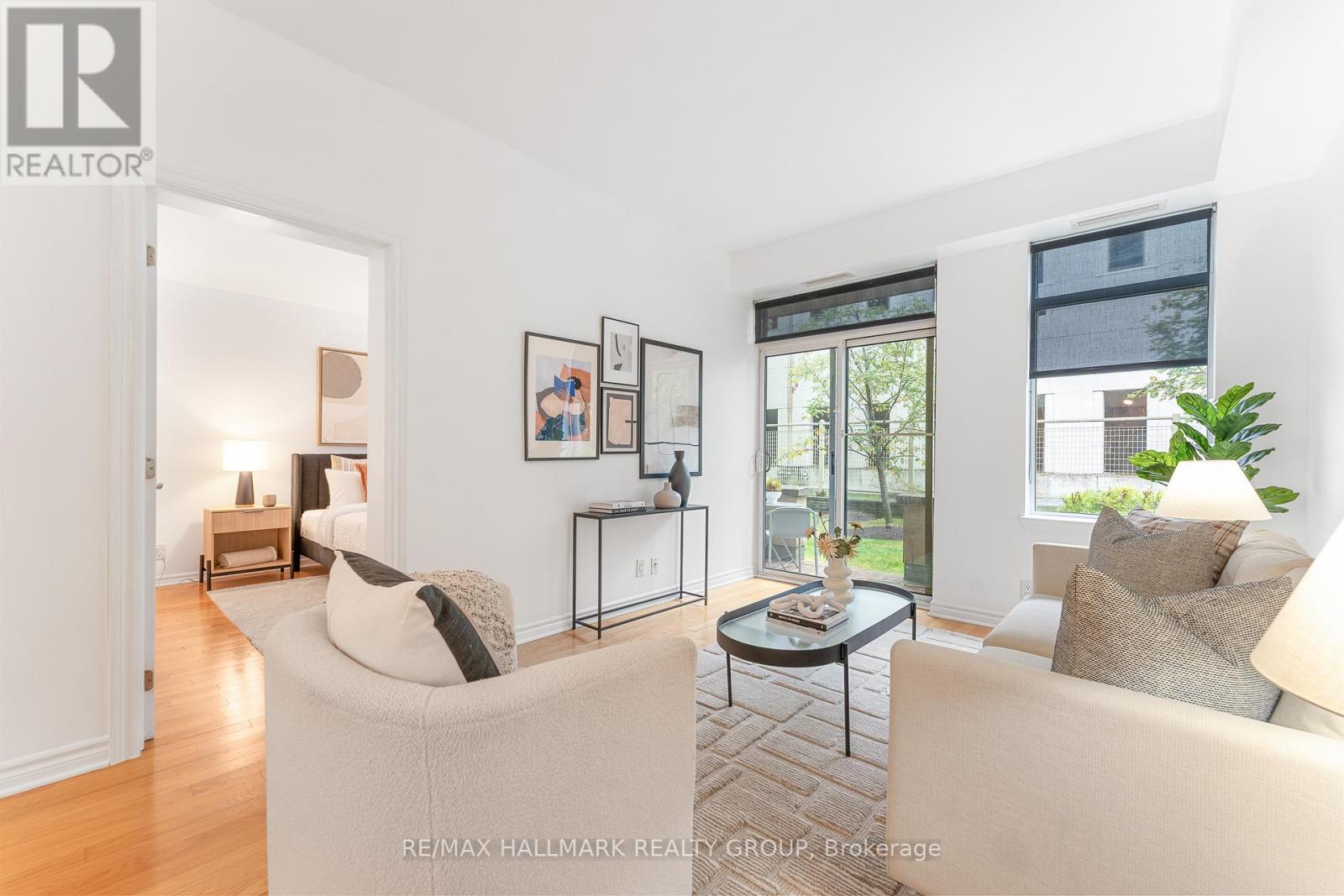 Welcome home! Nestled in the heart of Ottawas charming and historic Lowertown neighbourhood, this inviting one bedroom + den condo with soaring ceilings offers the perfect balance of comfort, function, and style. Tucked away on the ground level with beautiful walk out access, this home provides a rare sense of privacy and quiet in the city. Inside, you're welcomed by an open-concept layout designed for modern living, with a sleek kitchen featuring rich cabinetry, and an oversized breakfast bar that flows seamlessly into the spacious living area. Plus, a newly renovated bathroom with chic walk in glass shower is the cherry on top! The spacious Bedroom is a true retreat offering a tranquil escape - spacious and bright, and complete with a coveted walk-in closet that provides ample storage while keeping everything organized. Not to mention, the versatile Den with a built in Murphy bed is ideal for guests - or use as a home office, reading nook, or home gym! The options are endless here, adding flexibility to your lifestyle. Step through the patio doors to your private outdoor space, a peaceful retreat where you can relax and enjoy the seasons. In-suite laundry adds everyday convenience, while the included underground parking spot and storage locker provide security and practicality! The building itself is rich with amenities for its residents, including a fitness centre and rooftop terrace with BBQ. Beyond your door, the vibrant Lowertown community beckons with the Rideau River, ByWard Market, and National Gallery of Canada just steps away, you'll have endless opportunities for culture, dining, and recreation. This condo isn't just a place to live its a lifestyle to embrace. Come fall in love today! (id:31145)