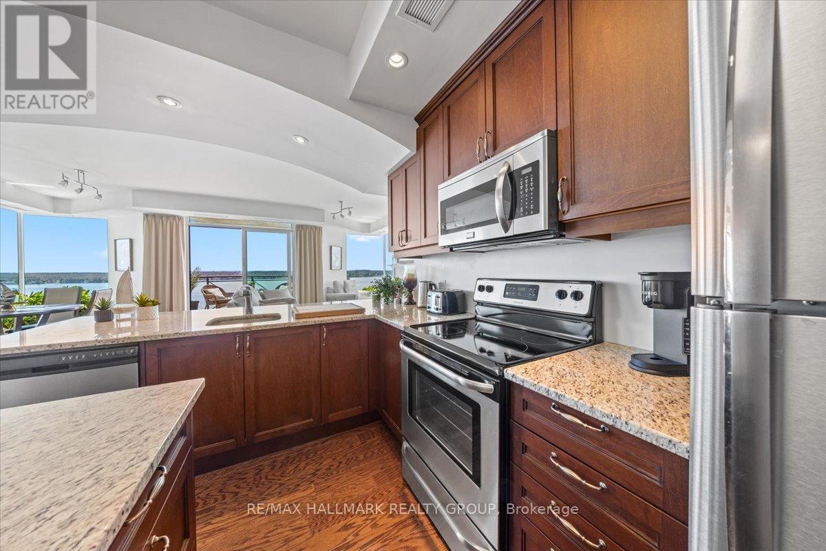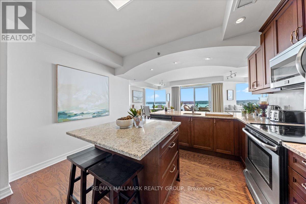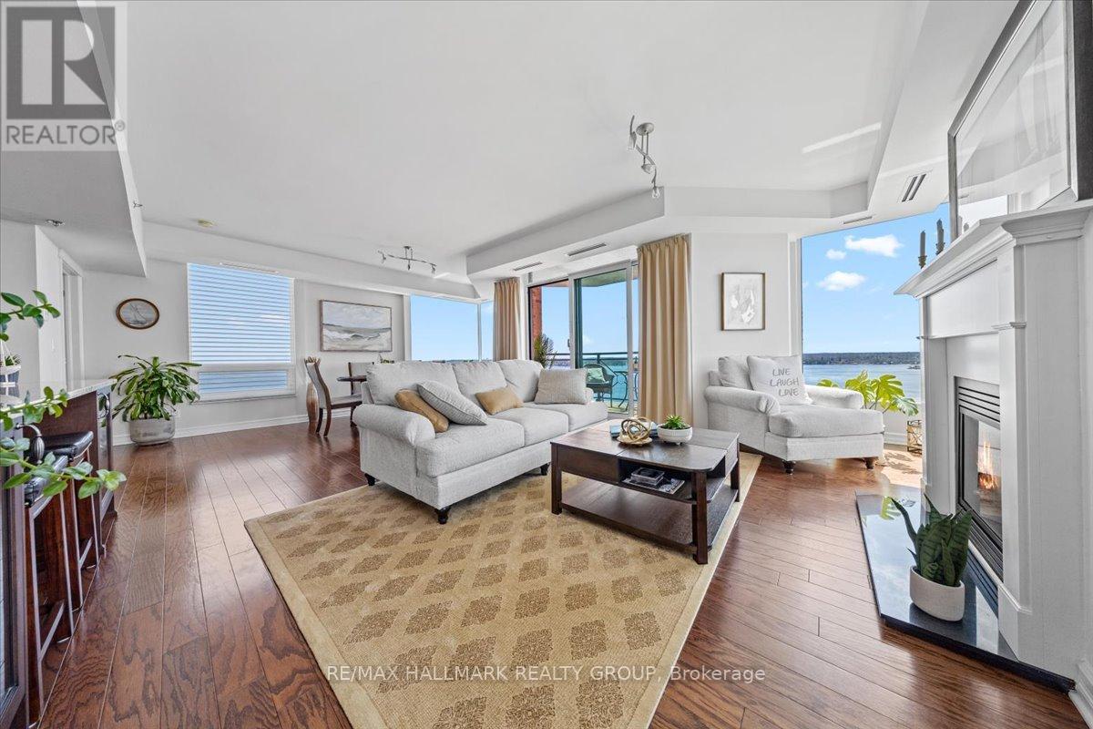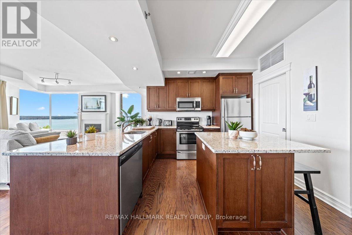 $1,470.67 MonthlyWelcome to Unit 1501 at Tall Ships Landing in beautiful Brockville. where luxury meets lifestyle. This spacious 2 bedroom + den residence offers breathtaking panoramic views of the St. Lawrence Seaway and features an open-concept layout with a seamless flow between the living room, dining area, and kitchen perfect for entertaining or relaxing in style. The primary bedroom boasts a generous walk-in closet and a spa-like 5-piece ensuite. A second bedroom, a full 4-piece bathroom, and a bonus den area provide flexible space for guests, a home office, or hobbies. Additional highlights include in-suite laundry cleverly tucked into a large pantry for added convenience. Enjoy resort-style amenities including an on-site restaurant, clubhouse, fitness centre, indoor pool, and stylish lounge areas. Waterfront living has never looked better! Deeded handicapped parking space #101. $150 monthly fee in addition to condo fees applies to all residents for garage maintenance. (id:31145)