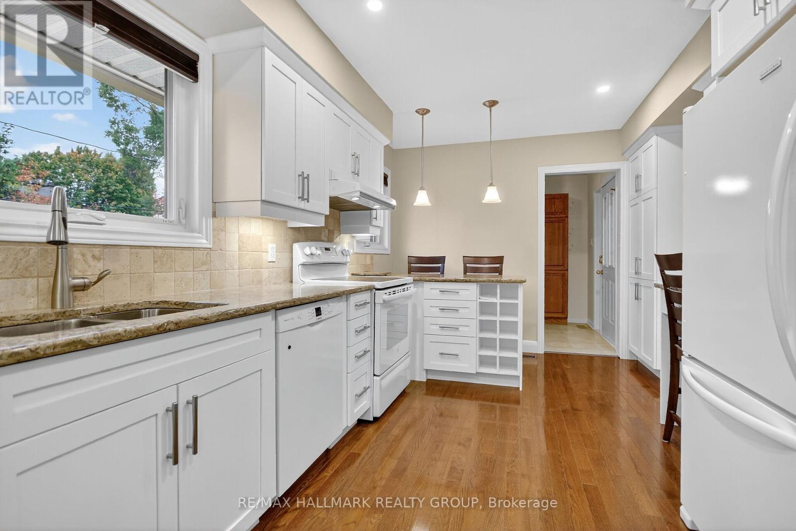 Welcome! Here is a classic Campeau built 1 1/2 storey home on one of Elmvale Acres nicest, child friendly streets. The mud room addition offers a spacious entrance foyer and closet as well as a handy full bath w. shower. The huge eat in gourmet kitchen is fully renovated with high end cabinets, appliances and quartz counters. The combined living/dining rooms are entertainment sized and boast ample sunlight and hardwood floors. The handy main level den/bedroom completes the main level. The second floor features 2 good sized bedrooms and a renovated full bath w. soaker tub. The basement level has plenty of storage, a recreation room and 2 piece bath...the basement possibilities are endless! The large backyard is fully fenced and hedged offering excellent privacy. Elmvale Acres is a fantastic neighborhood with easy access to greenspace, the hospitals, shopping and transit. A great place to call home! Come see all this wonderful home has to offer! 24 hours irrevocable on offers. (id:31145)