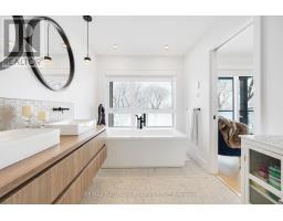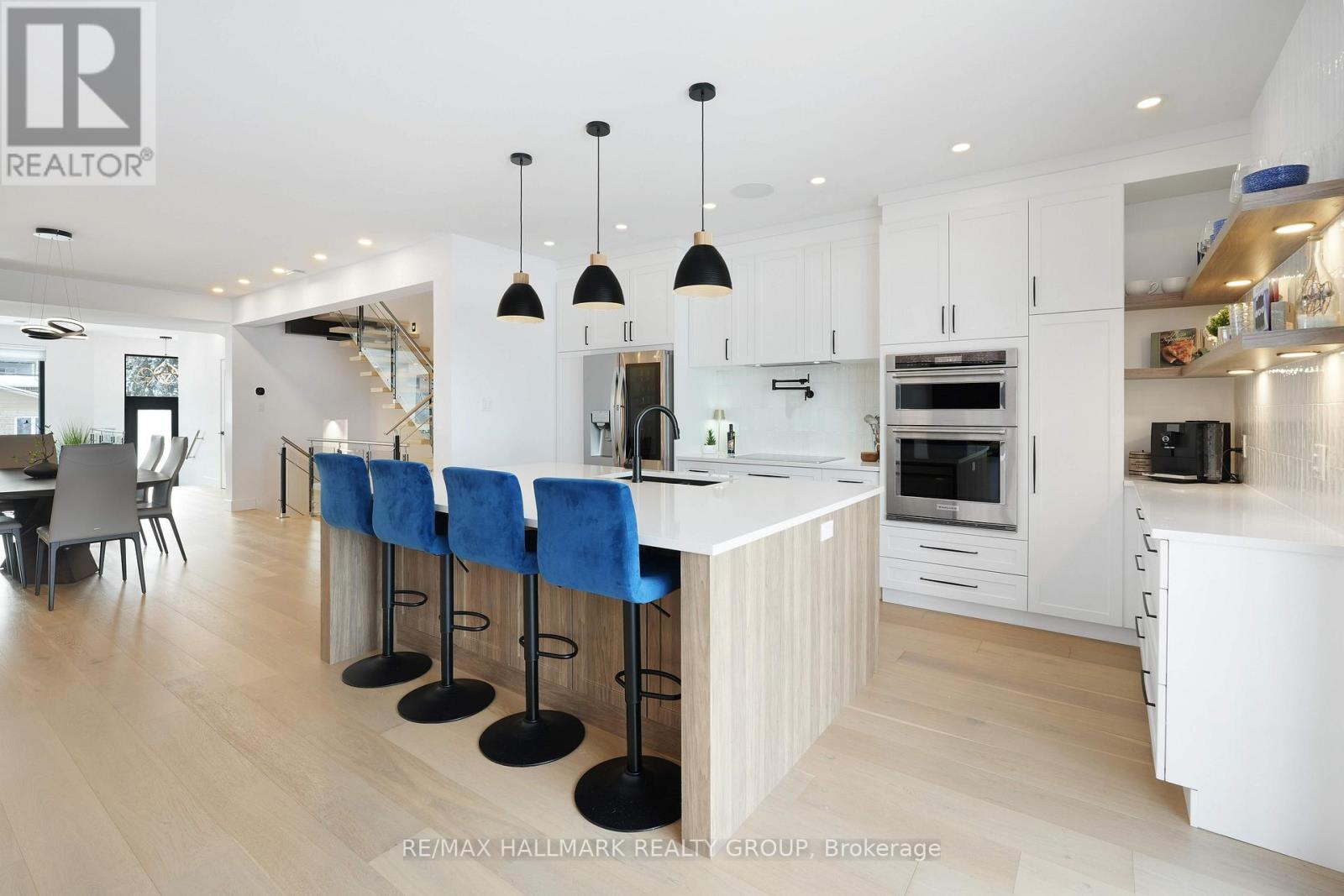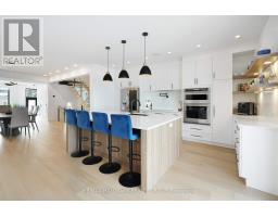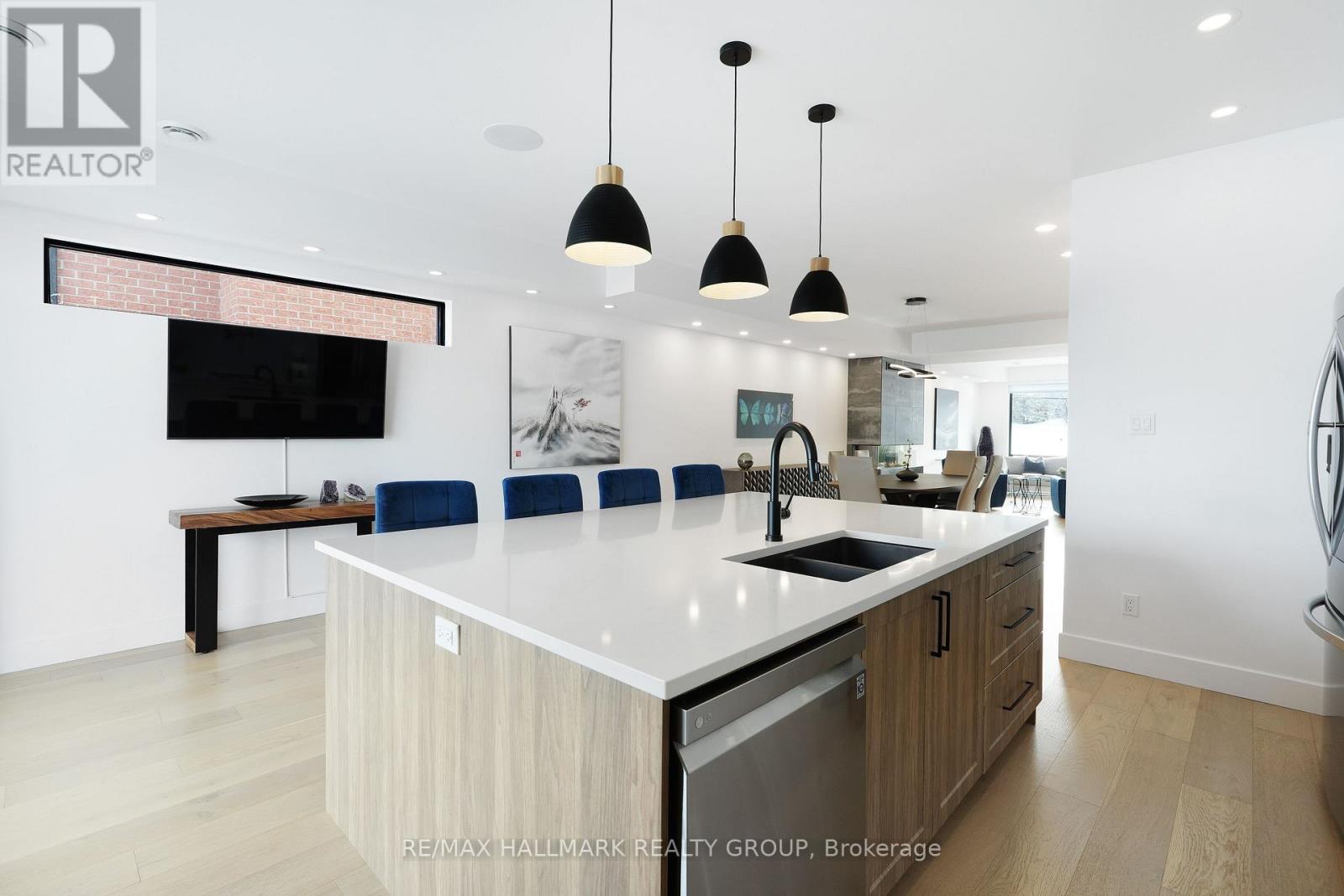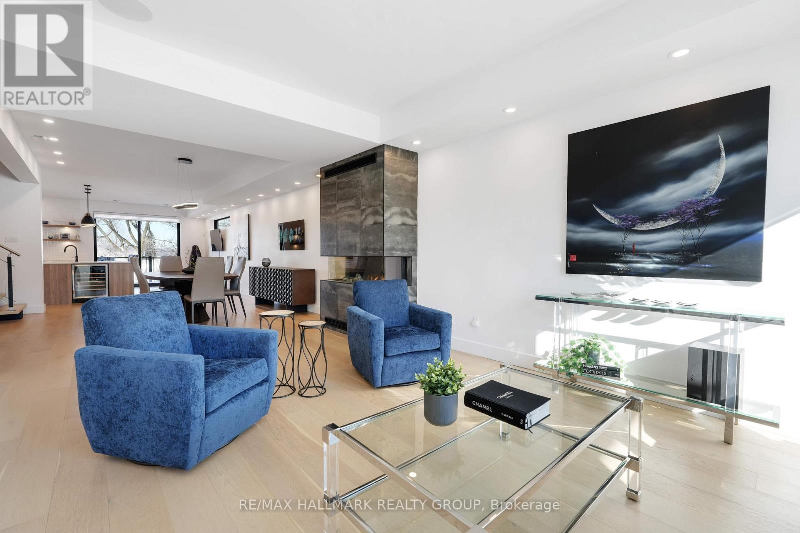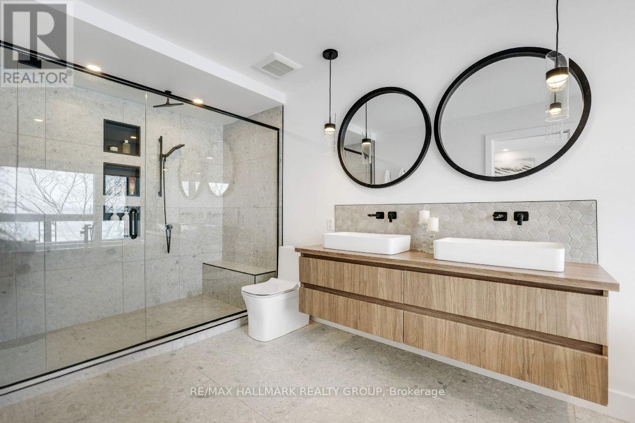Luxurious 3-Storey Residence Backing onto NCC Parkland w Panoramic Ottawa River & Gatineau Hills Views Built in 2023 and set in a quiet, tucked-away downtown location, this exceptional 3+1 bedroom residence backs directly onto NCC parkland and offers breathtaking year-round views of the Ottawa River and Gatineau Hills. Featuring striking architecture and curated designer finishes, this home delivers a rare blend of privacy, elegance, and an unparalleled riverside lifestyle. The open-concept main level is designed for both grand entertaining and refined everyday living. A spacious living room is anchored by a stunning three-sided gas fireplace, flowing seamlessly into an expansive dining area ideal for hosting large gatherings. The chef's kitchen is a true showpiece, showcasing a dramatic 5' x 8' quartz island, top-of-the-line cabinetry blending sleek modern finishes w textured wood accents, and exquisite appliances perfect for gourmet creations. A stylish powder room with floating vanity & designer wave-pattern accent tile completes the level. Step outside to the spacious terrace off the kitchen, ideal for al fresco dining with tranquil river views. The second level features a serene primary suite with captivating vistas of the Gatineau Hills. The spa-inspired ensuite offers a double glass steam shower, freestanding soaker tub, double vanity, imported porcelain tile finishes. Two additional generous bedrooms share a beautifully appointed guest bath. A thoughtfully designed laundry room includes full-size appliances, folding counter, and hanging rod. Steps lead up to the spectacular rooftop terrace with sitting area, six-person hot tub, and aluminum and glass railings creating a private elevated retreat. The walk-out lower level offers an additional bedroom, full bath, & spacious media room with terrace doors to the patio and fenced rear garden with private gate to parkland. Garage includes workshop space and secure storage. Simply unbeatable. (id:31145)