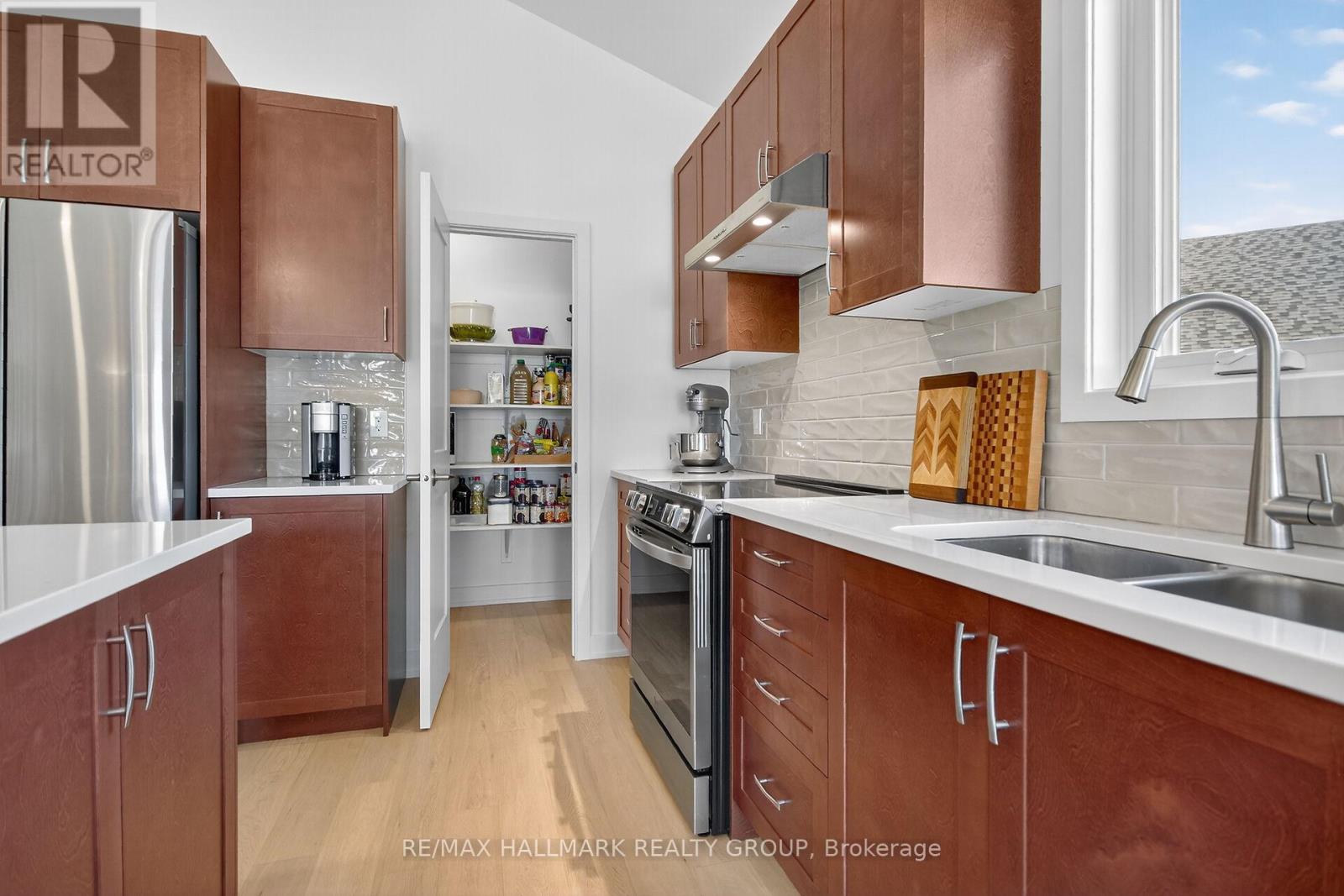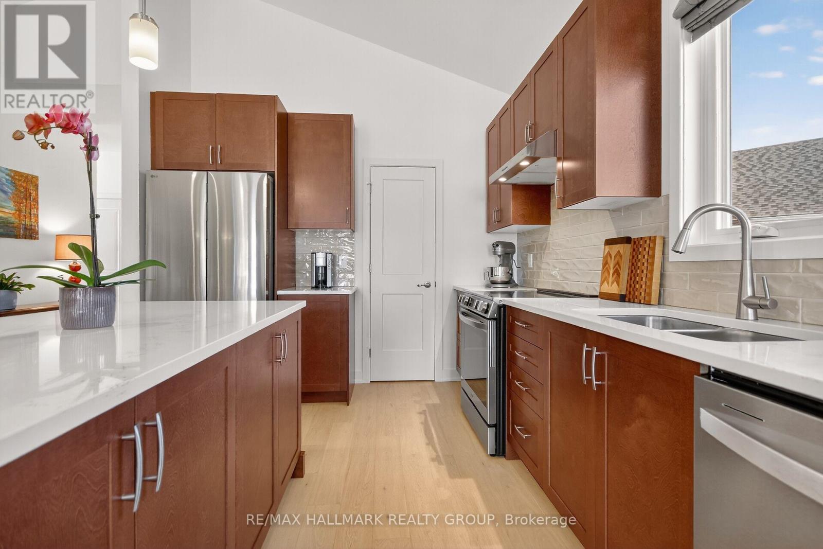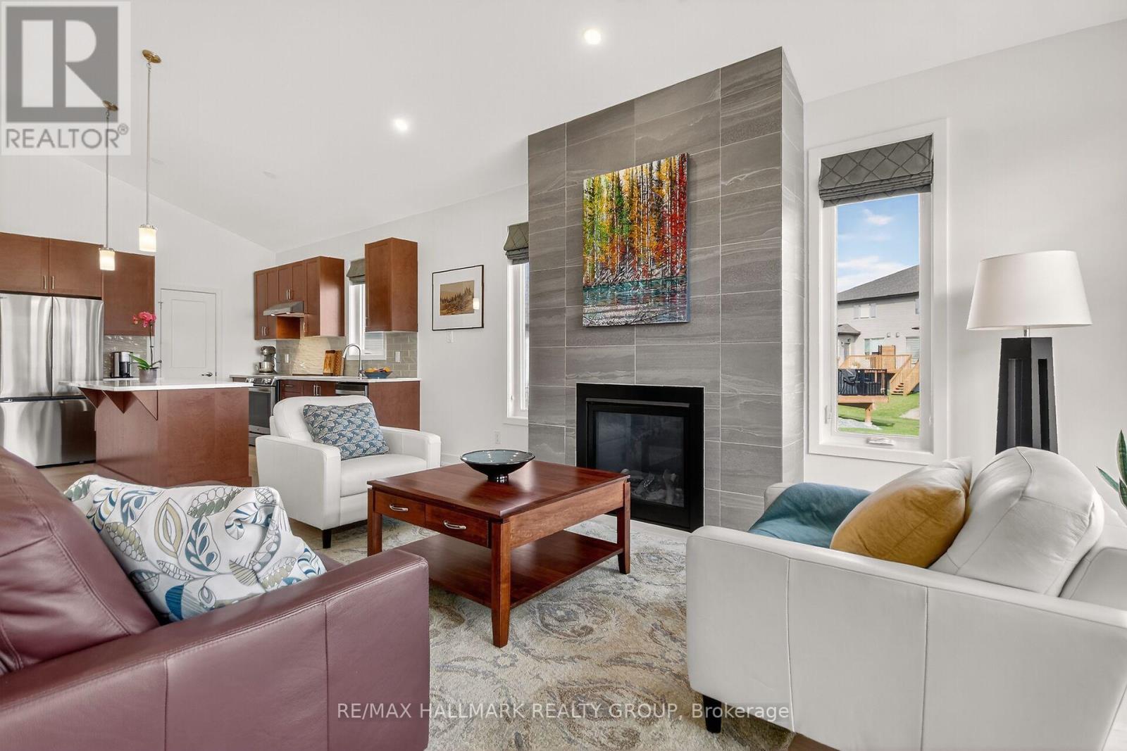 Welcome to this beautifully crafted bungalow, ideally situated just minutes from downtown Carleton Place and a short stroll to the serene Mississippi River. Thoughtfully designed and impeccably maintained, this 2+1 bedroom, 3 full bathroom home blends style, comfort, and quality upgrades throughout.The open-concept main level is bright and inviting, featuring hardwood flooring, pot lights, and a welcoming den - perfect for a home office or cozy reading nook. The kitchen showcases quartz countertops, a large pantry with a convenient electrical outlet, and a water line to the fridge for everyday ease. The spacious living and dining areas flow effortlessly, creating an ideal space for hosting family and friends.Both main floor bathrooms feature quartz counters, adding a cohesive and upscale touch. The main floor laundry room is designed for everyday function, complete with upper cabinets for added storage. Built with attention to detail inside and out, this home includes R60 attic insulation and a fully insulated garage for year-round comfort and efficiency. Set on a premium lot, the property offers plenty of outdoor space to relax and enjoy the peaceful surroundings. The finished lower level expands your living area with a warm family room for movie nights a hobby area perfect for crafting, games or creative projects. A third bedroom, a brand-new full bathroom (completed in 2025), and a generous storage space that can easily adapt to your needs.Backed by a Tarion warranty for peace of mind, this exceptional bungalow combines modern finishes, smart design, and a prime location - ready to welcome you home. (id:31145)