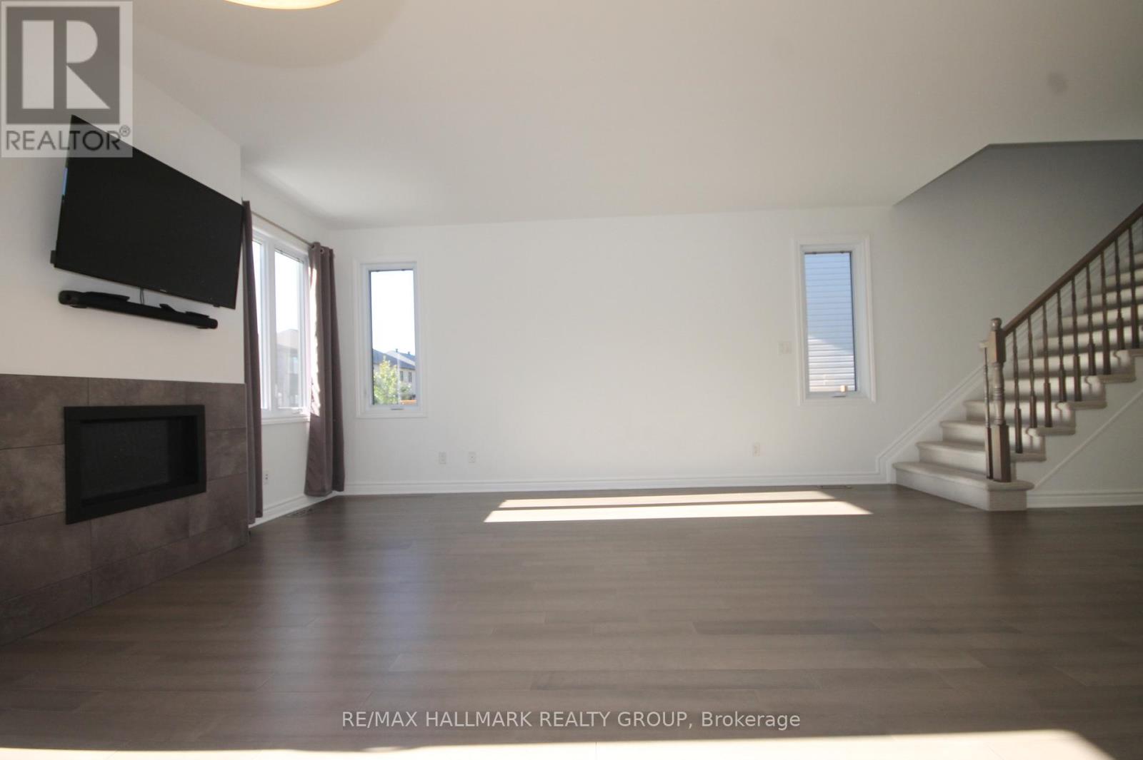 Nestled in a quiet, family-friendly neighbourhood, this bright and modern 3-bedroom, 3-bathroom end-unit townhouse offers style and convenience. The spacious open-concept main floor features a modern kitchen with a centre island, subway tile backsplash, and stainless steel appliances. The dining and family room, highlighted by a cozy gas fireplace, opens to a private rear yard-perfect for entertaining or relaxing. Upstairs, the primary bedroom includes a walk-in closet and ensuite bath, while bedrooms two and three each feature their own walk-in closets. Convenient second-floor laundry adds everyday ease. The lower level awaits your finishing touches, offering great potential for added living space.With an oversized laneway and close proximity to parks, schools, and local amenities, this home delivers the best of small-town living - just minutes from Ottawa. (id:31145)
