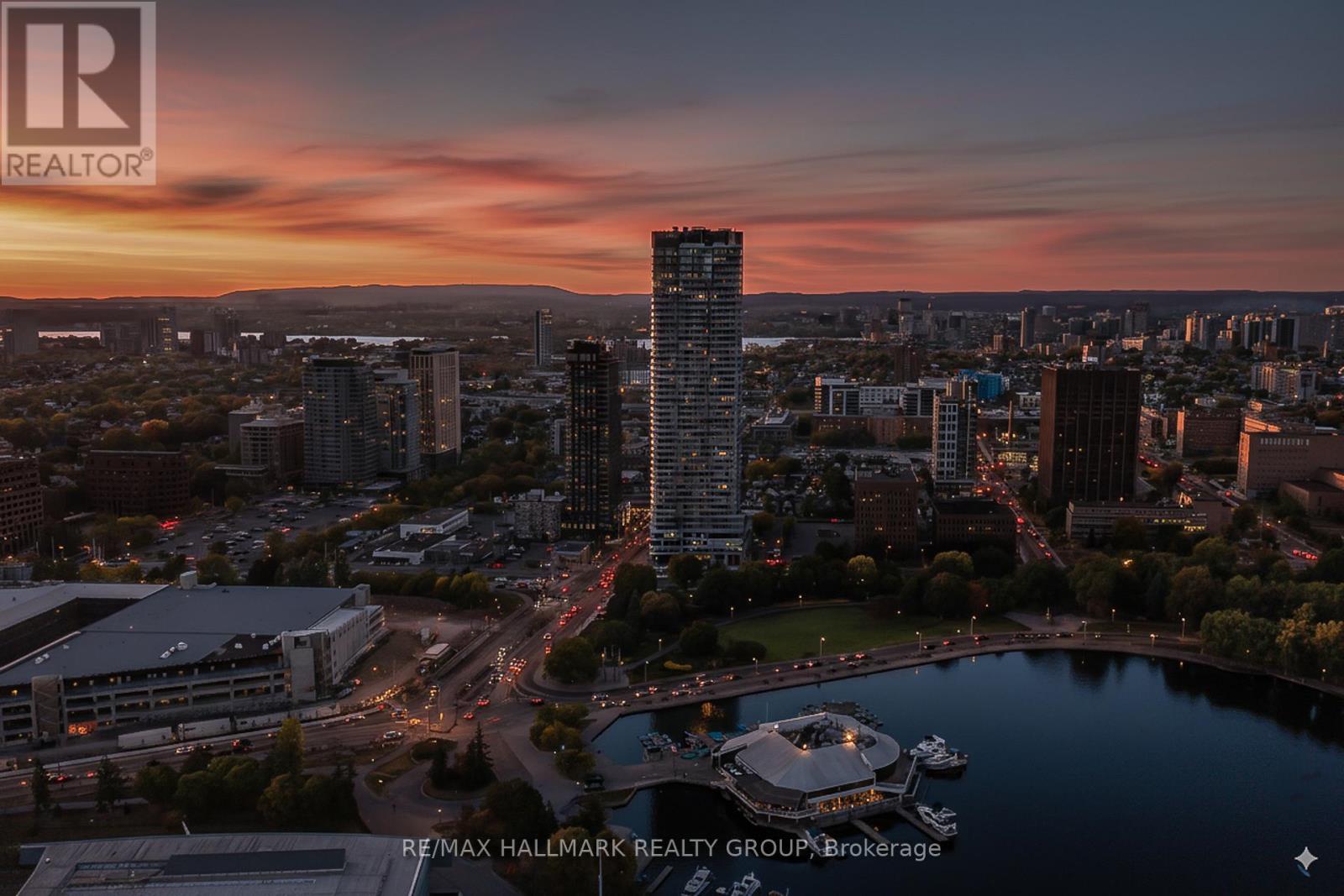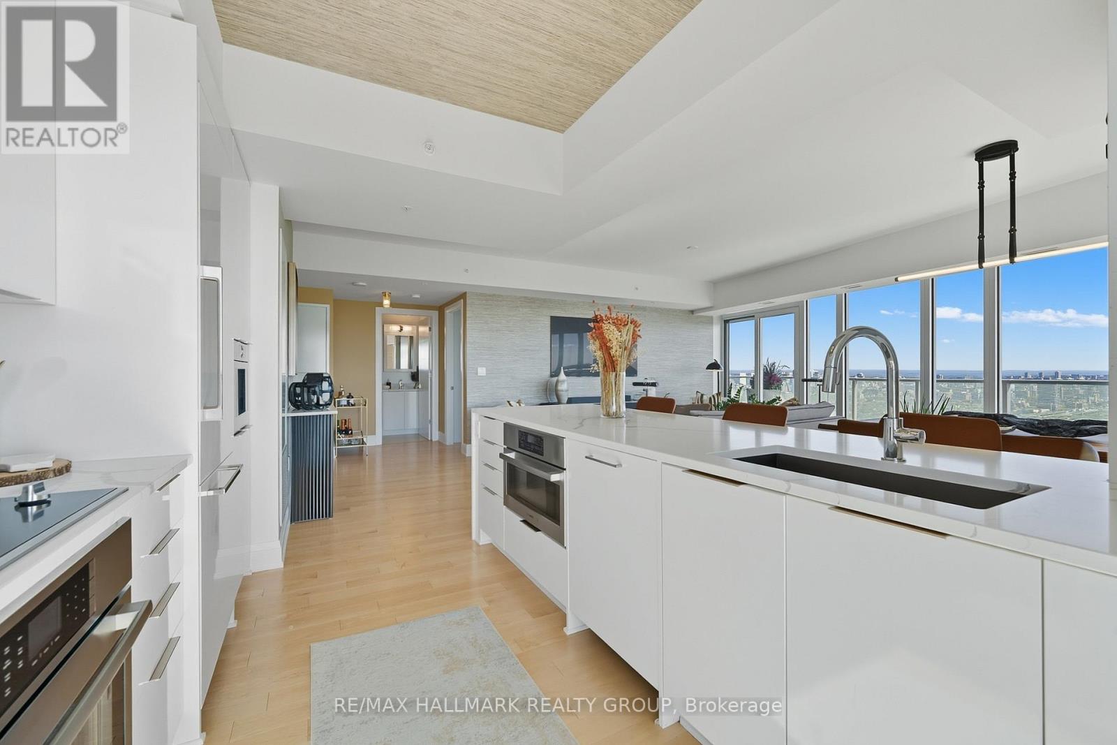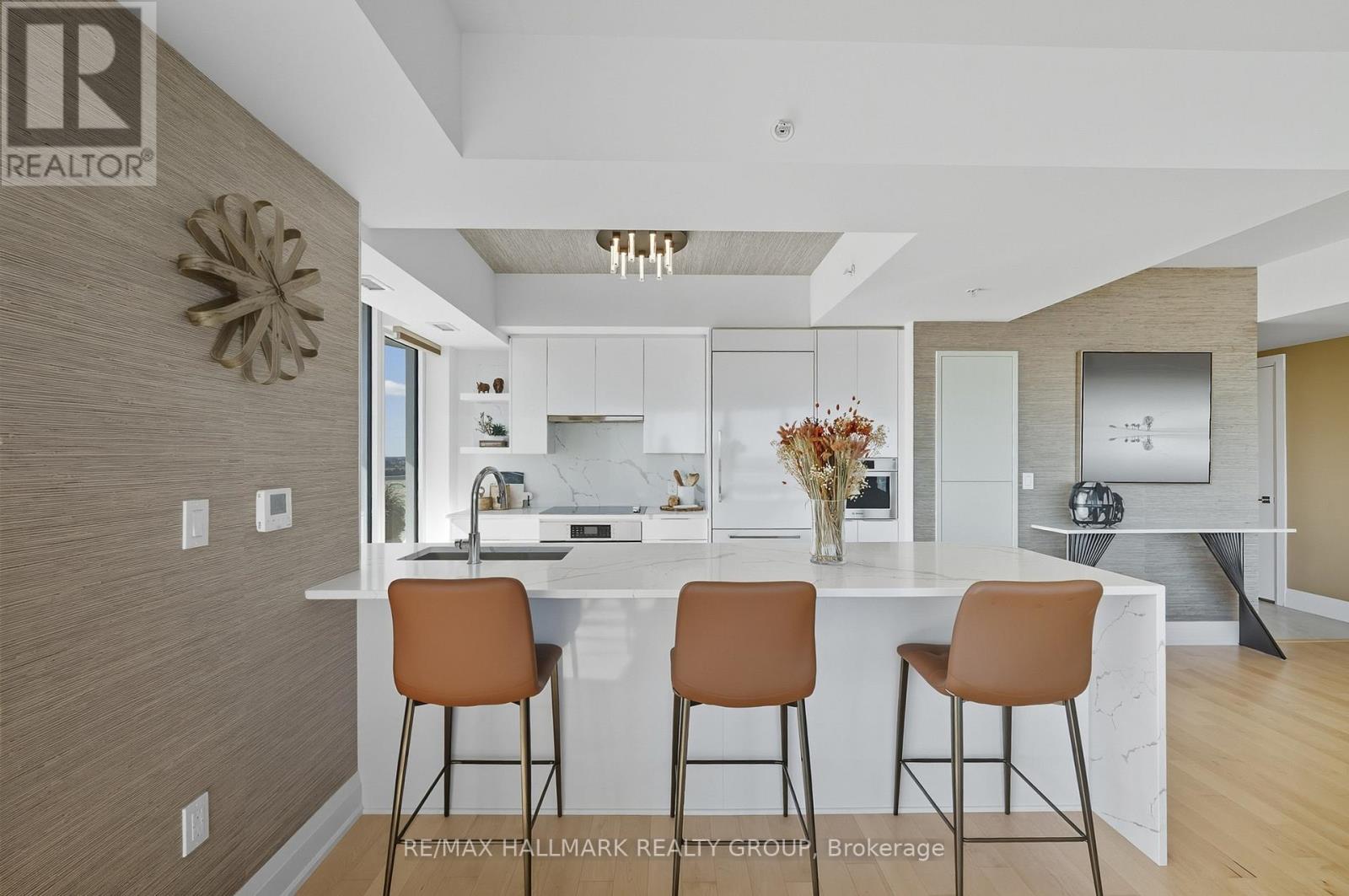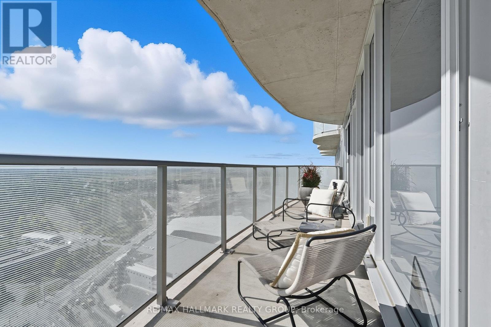 Introducing the coveted New Safdie Model at Claridge Icon - Ottawa's tallest residential tower, rising elegantly above West Centre Town. This modern masterpiece redefines luxury condo living with flawless design, panoramic views, and an unrivalled lifestyle. Step inside to discover an open-concept layout adorned with floor-to-ceiling, wall-to-wall windows, immersing the residence in natural light while framing breathtaking southeast vistas of Dow's Lake, the city skyline, and beyond. Multiple access points lead to a spectacular wraparound balcony, the perfect stage for entertaining or enjoying serene morning coffees above the city. The gourmet kitchen is a showcase of refined minimalism, featuring sleek white cabinetry, premium integrated appliances including two built-in ovens, a cooktop, and a built-in coffee machine, all anchored by a stylish breakfast bar. Flow seamlessly into the expansive living and dining area where rich hardwood floors and clean architectural lines create an ambiance of understated elegance. Retreat to the serene primary suite, complete with a spacious walk-in closet and spa-inspired ensuite boasting a walk-in rain shower. A second bedroom and a luxurious 4-piece bath with rain shower provide comfort and versatility, while in-unit laundry adds convenience. This residence is complemented by two underground parking spaces & a storage locker, ensuring both practicality and prestige. Claridge Icon residents enjoy a curated collection of world-class amenities including 24hr concierge, indoor pool, sauna, fitness centre, rooftop terrace with community BBQs, elegant party & meeting rooms, guest suites for visiting friends & family and ample visitor parking. Situated at the nexus of culture and convenience, you are steps from the Rideau Canal, NCC walking trails, vibrant Little Italy with its cafés and restaurants and enjoy the ease of effortless public transit access right at your doorstep. Available For Rent. Monthly Rent: $4,995.00 + Hydro. (id:31145)