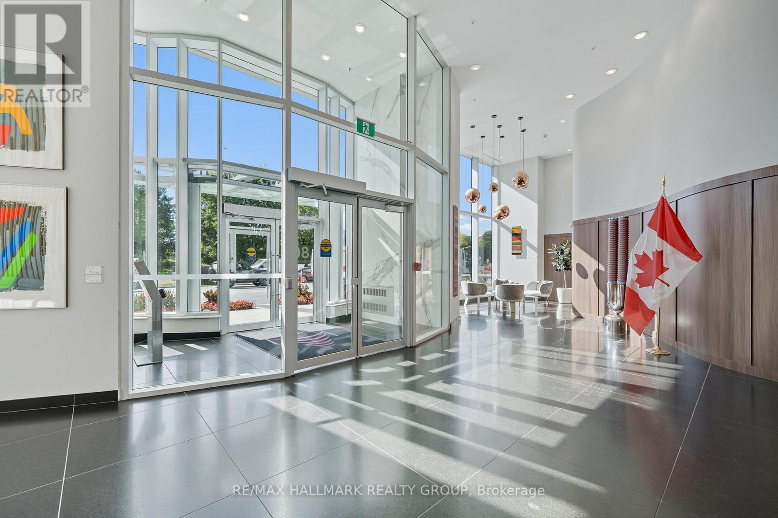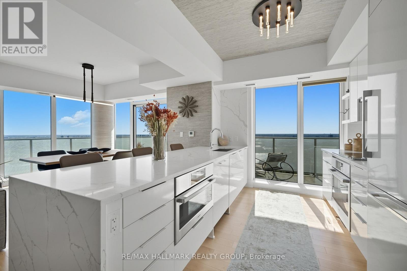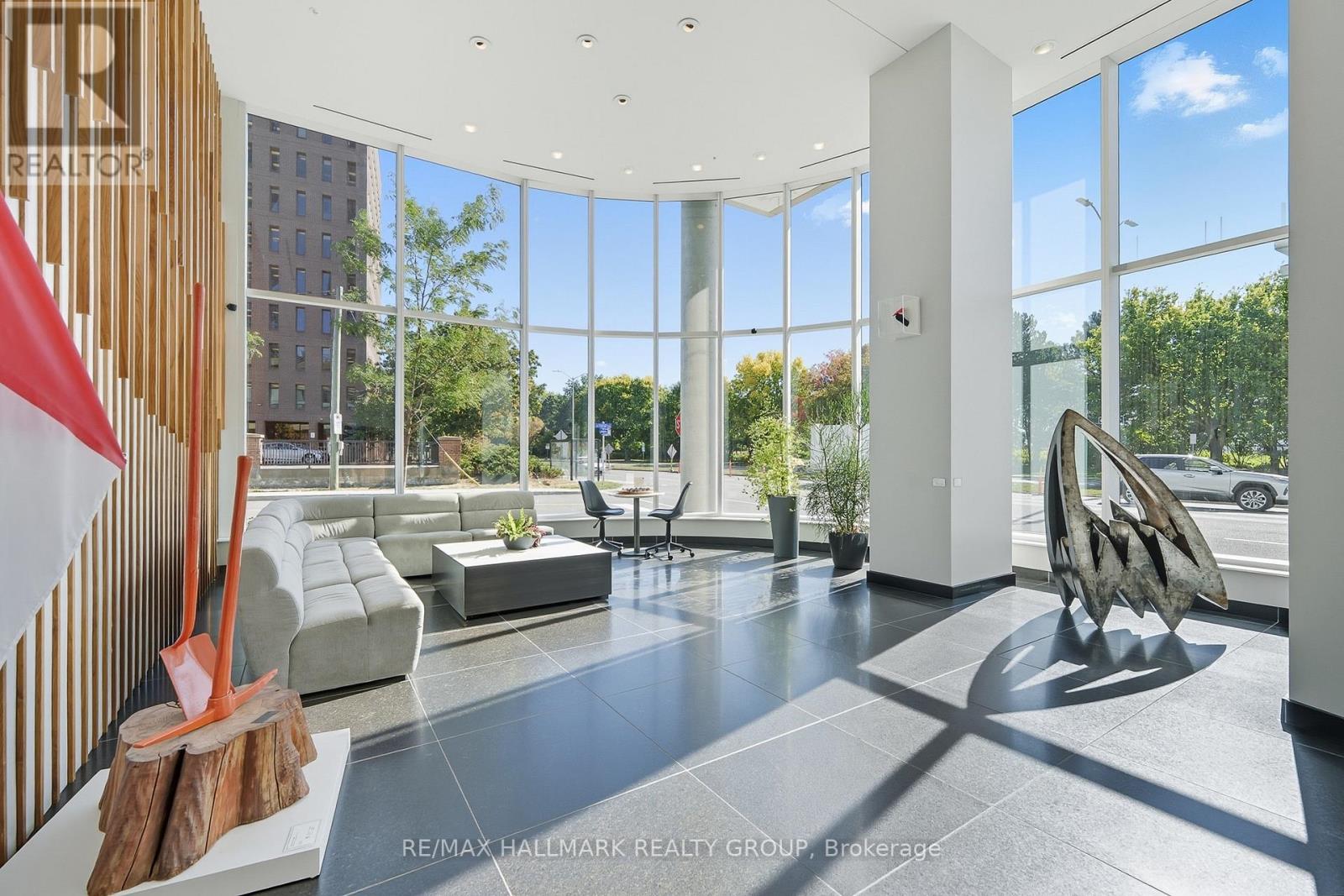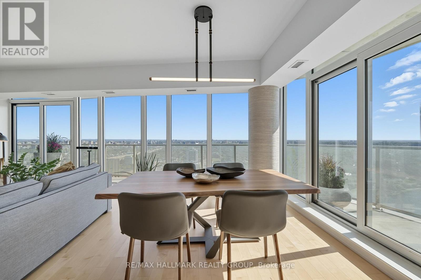 Introducing the coveted New Safdie Model at Claridge Icon - Ottawa's tallest residential tower, rising elegantly above West Centre Town. This modern masterpiece redefines luxury condo living with flawless design, panoramic views, and an unrivalled lifestyle. Step inside to discover an open-concept layout adorned with floor-to-ceiling, wall-to-wall windows, immersing the residence in natural light while framing breathtaking southeast vistas of Dow's Lake, the city skyline, and beyond. Multiple access points lead to a spectacular wraparound balcony, the perfect stage for entertaining or enjoying serene morning coffees above the city. The gourmet kitchen is a showcase of refined minimalism, featuring sleek white cabinetry, premium integrated appliances including two built-in ovens, a cooktop, and a built-in coffee machine, all anchored by a stylish breakfast bar. Flow seamlessly into the expansive living and dining area where rich hardwood floors and clean architectural lines create an ambiance of understated elegance. Retreat to the serene primary suite, complete with a spacious walk-in closet and spa-inspired ensuite boasting a walk-in rain shower. A second bedroom and a luxurious 4-piece bath with rain shower provide comfort and versatility, while in-unit laundry adds convenience. This residence is complemented by two underground parking spaces & a storage locker, ensuring both practicality and prestige. Claridge Icon residents enjoy a curated collection of world-class amenities including 24hr concierge, indoor pool, sauna, fitness centre, rooftop terrace with community BBQs, elegant party & meeting rooms, guest suites for visiting friends & family and ample visitor parking. Situated at the nexus of culture and convenience, you are steps from the Rideau Canal, NCC walking trails, vibrant Little Italy with its cafés and restaurants and enjoy the ease of effortless public transit access right at your doorstep. Available For Rent. Monthly Rent: $4,995.00 + Hydro. (id:31145)