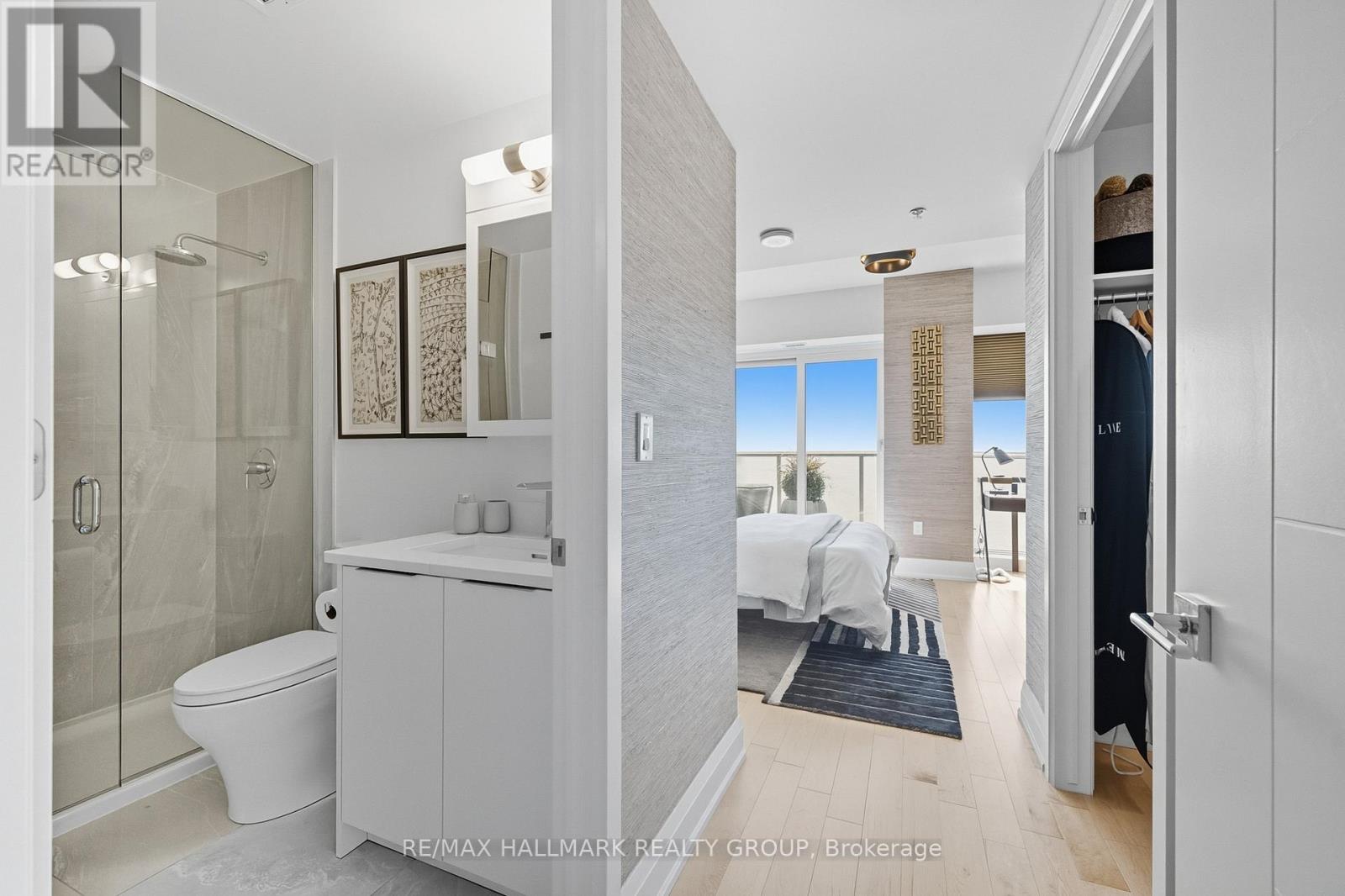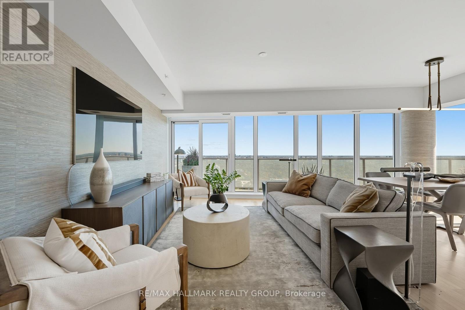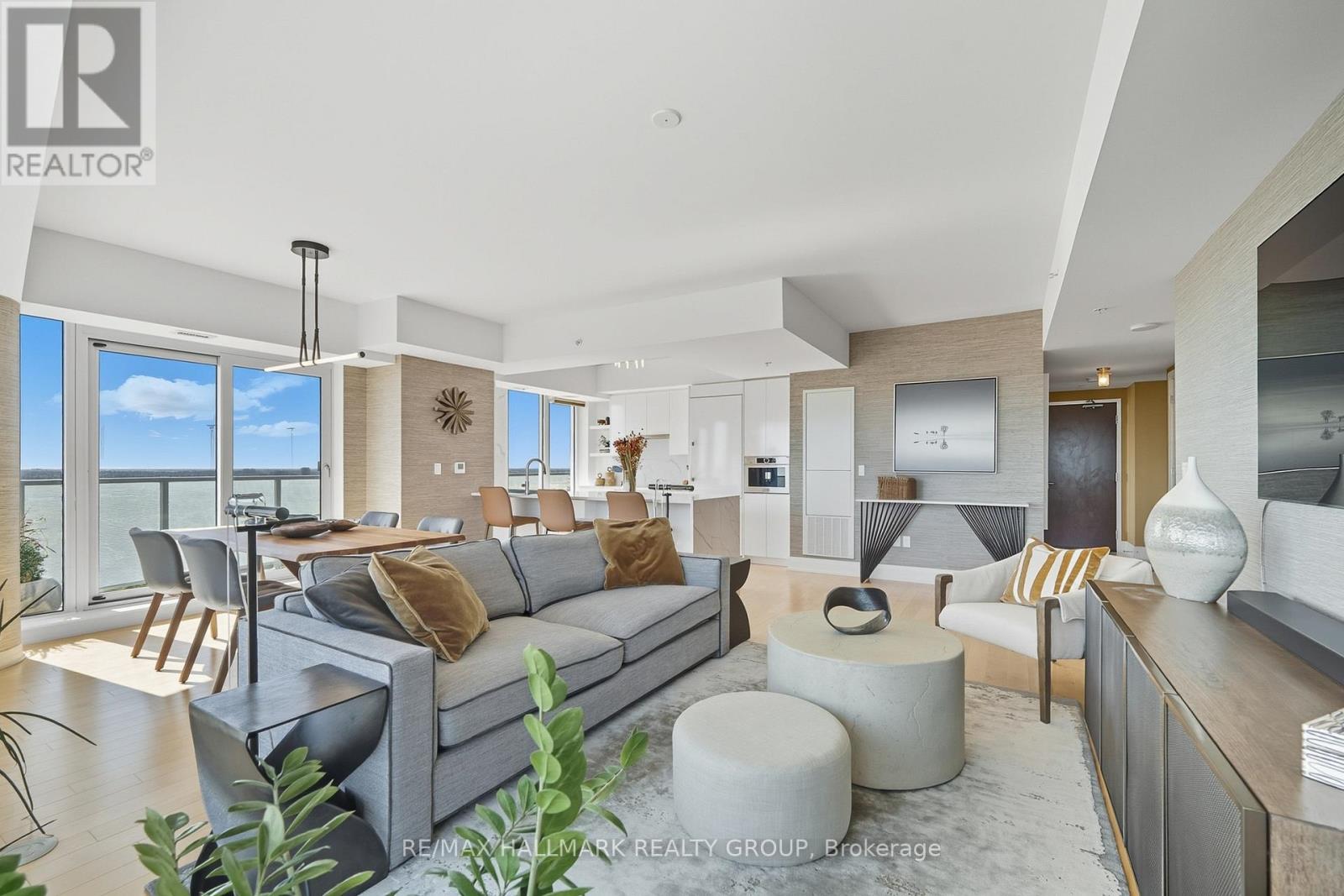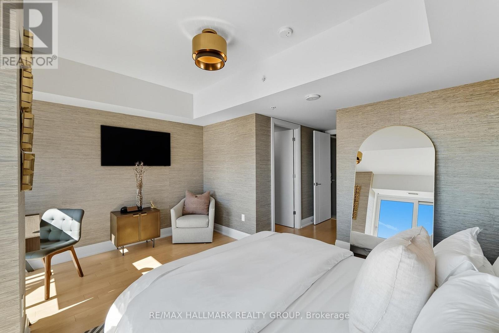Introducing the coveted New Safdie Model at Claridge Icon - Ottawa's tallest residential tower, rising elegantly above West Centre Town. This modern masterpiece redefines luxury condo living with flawless design, panoramic views, and an unrivalled lifestyle. Step inside to discover an open-concept layout adorned with floor-to-ceiling, wall-to-wall windows, immersing the residence in natural light while framing breathtaking southeast vistas of Dow's Lake, the city skyline, and beyond. Multiple access points lead to a spectacular wraparound balcony, the perfect stage for entertaining or enjoying serene morning coffees above the city. The gourmet kitchen is a showcase of refined minimalism, featuring sleek white cabinetry, premium integrated appliances including two built-in ovens, a cooktop, and a built-in coffee machine, all anchored by a stylish breakfast bar. Flow seamlessly into the expansive living and dining area where rich hardwood floors and clean architectural lines create an ambiance of understated elegance. Retreat to the serene primary suite, complete with a spacious walk-in closet and spa-inspired ensuite boasting a walk-in rain shower. A second bedroom and a luxurious 4-piece bath with rain shower provide comfort and versatility, while in-unit laundry adds convenience. This residence is complemented by two underground parking spaces & a storage locker, ensuring both practicality and prestige. Claridge Icon residents enjoy a curated collection of world-class amenities including 24hr concierge, indoor pool, sauna, fitness centre, rooftop terrace with community BBQs, elegant party & meeting rooms, guest suites for visiting friends & family and ample visitor parking. Situated at the nexus of culture and convenience, you are steps from the Rideau Canal, NCC walking trails, vibrant Little Italy with its cafés and restaurants and enjoy the ease of effortless public transit access right at your doorstep. Available For Rent. Monthly Rent: $4,995.00 + Hydro. (id:31145)