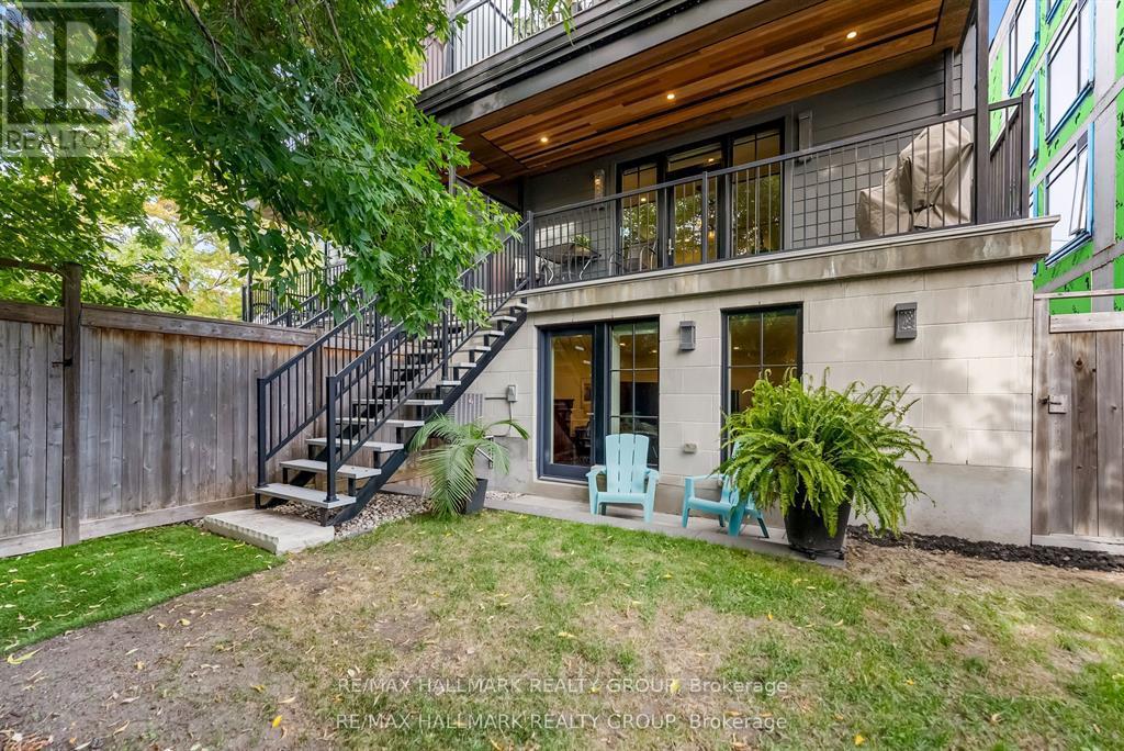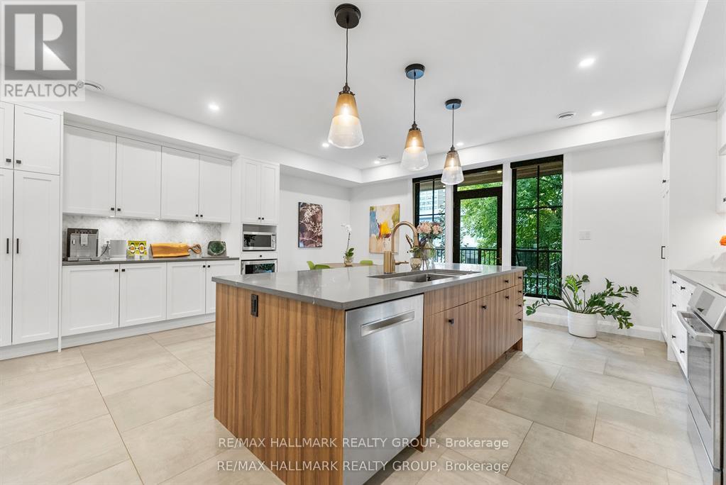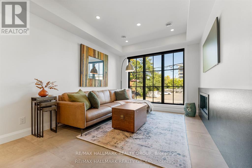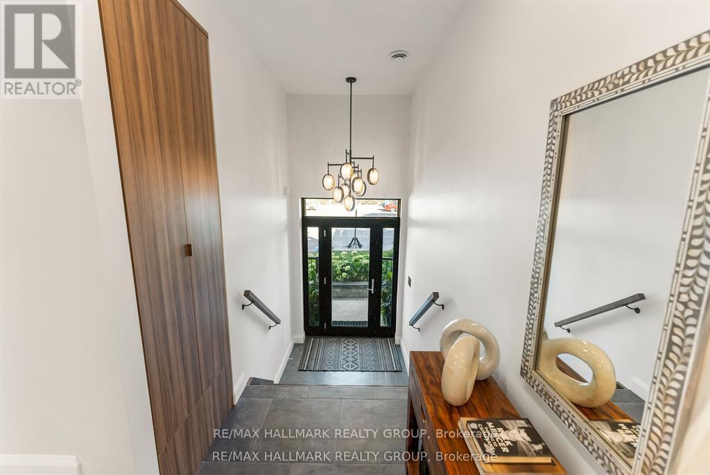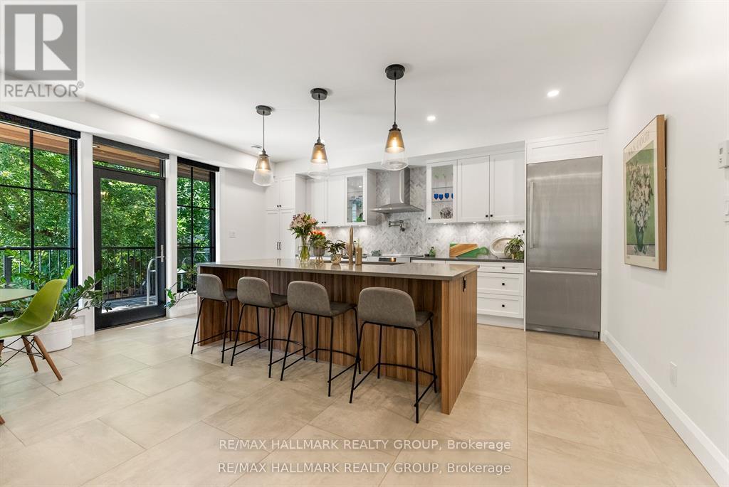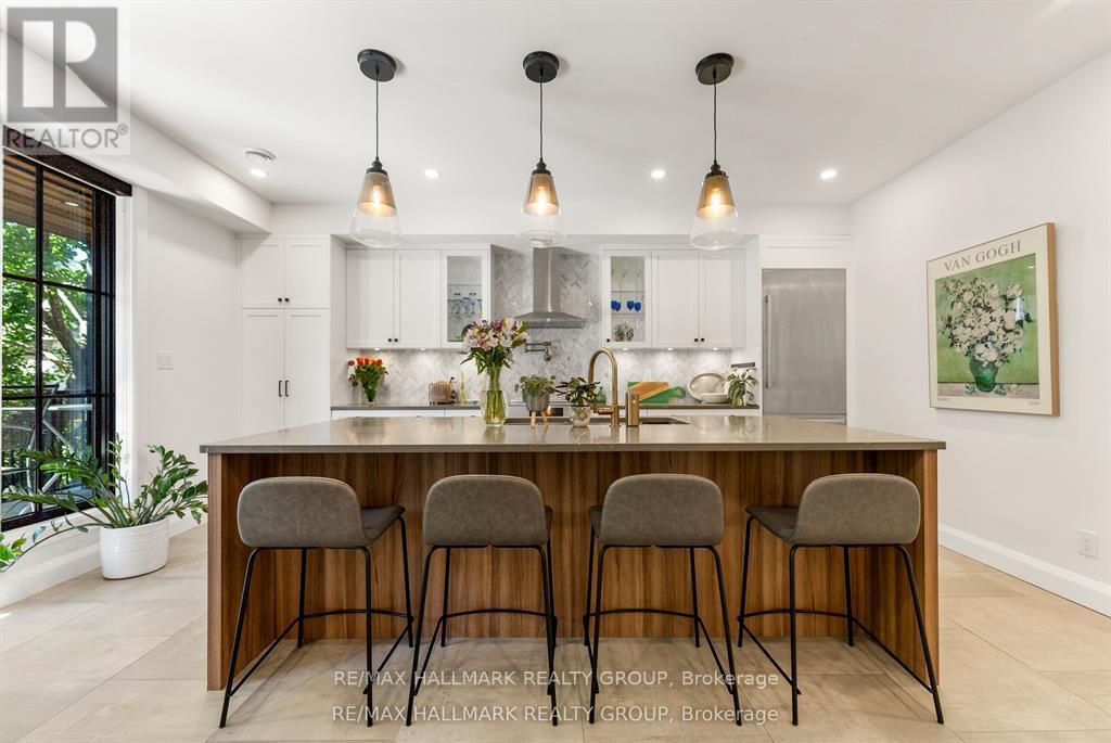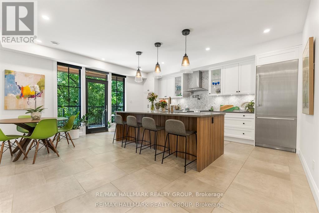 Welcome to your exquisite New York-style brownstone nestled in the vibrant Westboro Village.This stunning residence offers an unparalleled lifestyle for those who cherish the art of living.Step outside and find yourself within walking distance of the finest restaurants, boutique shops, or explore your culinary skills with fresh, local ingredients from the summer Farmers Market around the corner.Enter through an exterior heated floor into a foyer crowned by a compass-inspired chandelier. Glass and walnut railings lead to a living area anchored by a leathered granite-slab fireplace and a Frame TV for rotating art display while the dining room dazzles under custom lighting.For those who love to cook, the kitchen is a culinary dream come true.It boasts an oversized island and a delightful dining alcove, equipped with high-end Bosch appliances, a wine fridge, a chef's sink, and ample storage.Picture yourself gather for summer evening barbecues and dine al fresco on the inviting porch, while radiant in-floor heating ensures year-round comfort.A skylit,illuminated stairway rises to the upper level, where you'll find the spacious primary suite with its luxurious dressing area and a black-and-white tiled ensuite with heated floors and skylight. Step outside onto your private exterior deck, perfect for summer lounging.Two additional bedrooms feature walnut floors. A beautifully appointed bathroom showcases in-floor heating & skylight.Dedicated laundry room adds daily ease.Discover versatile living on the lower level, complete with a private entrance, full-height windows and direct access to a charming backyard. Enjoy heated polished concrete floors, stunning bathroom with washer/dryer & roughed-in plumbing for a bar or kitchen, making this an ideal in-law suite.Constructed with reinforced concrete, cold-formed steel and an acid-washed brick exterior, plus a snow-melting driveway, this home blends lasting strength with refined aesthetics.Embrace the Westboro Village lifestyle! (id:31145)
