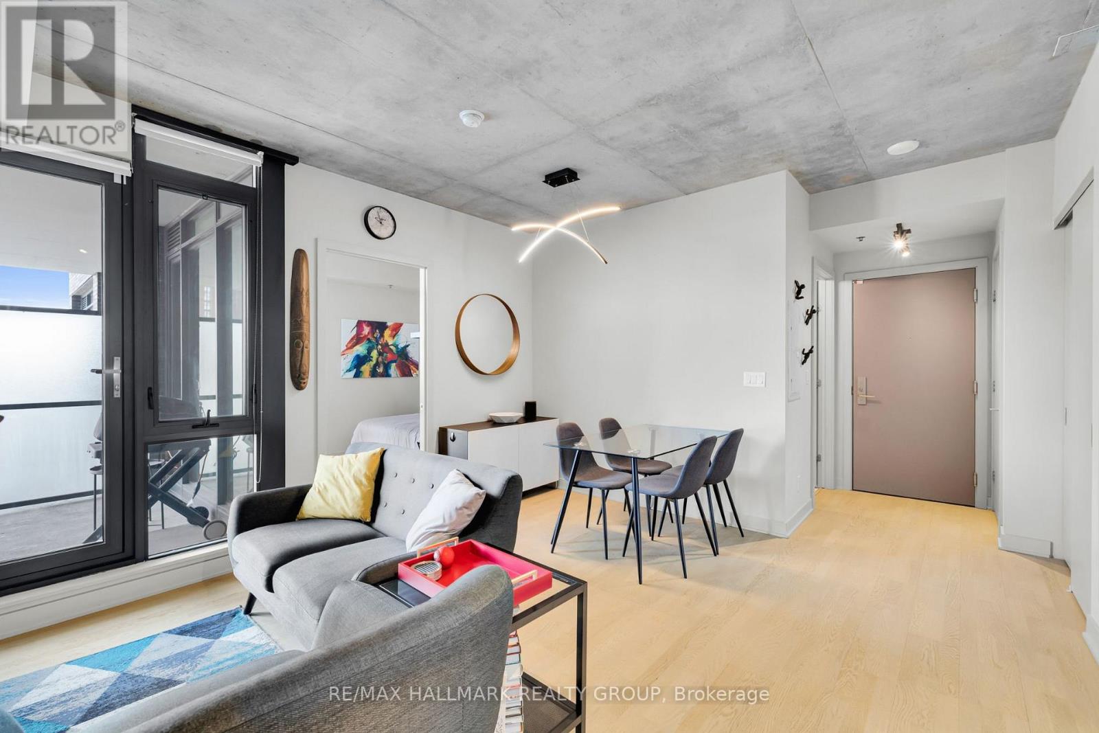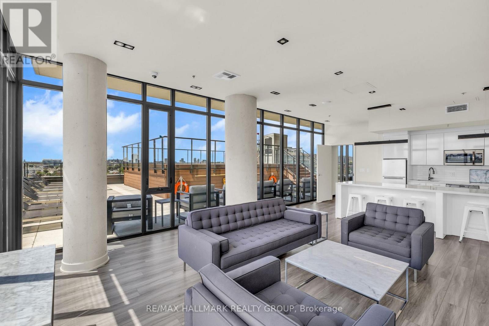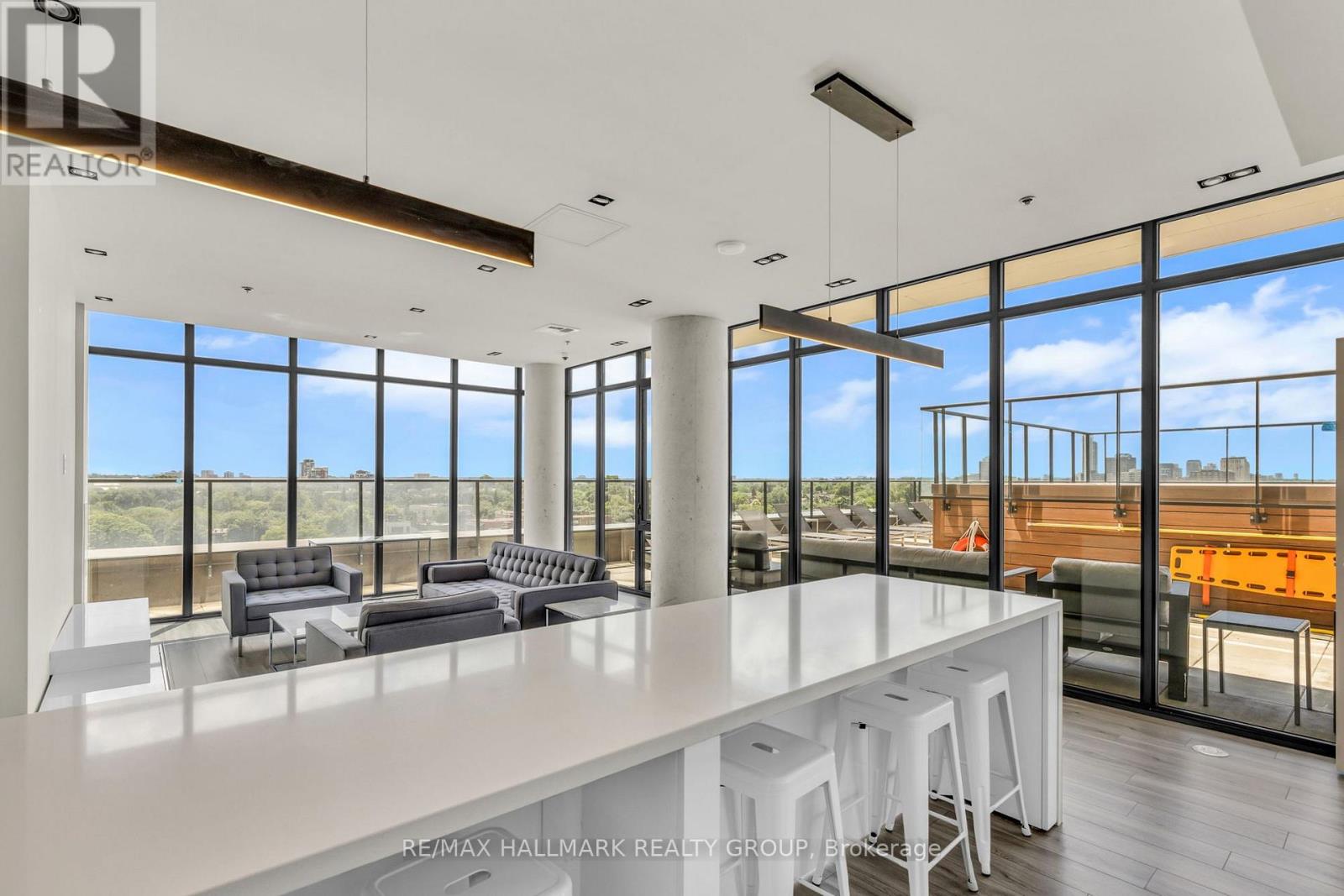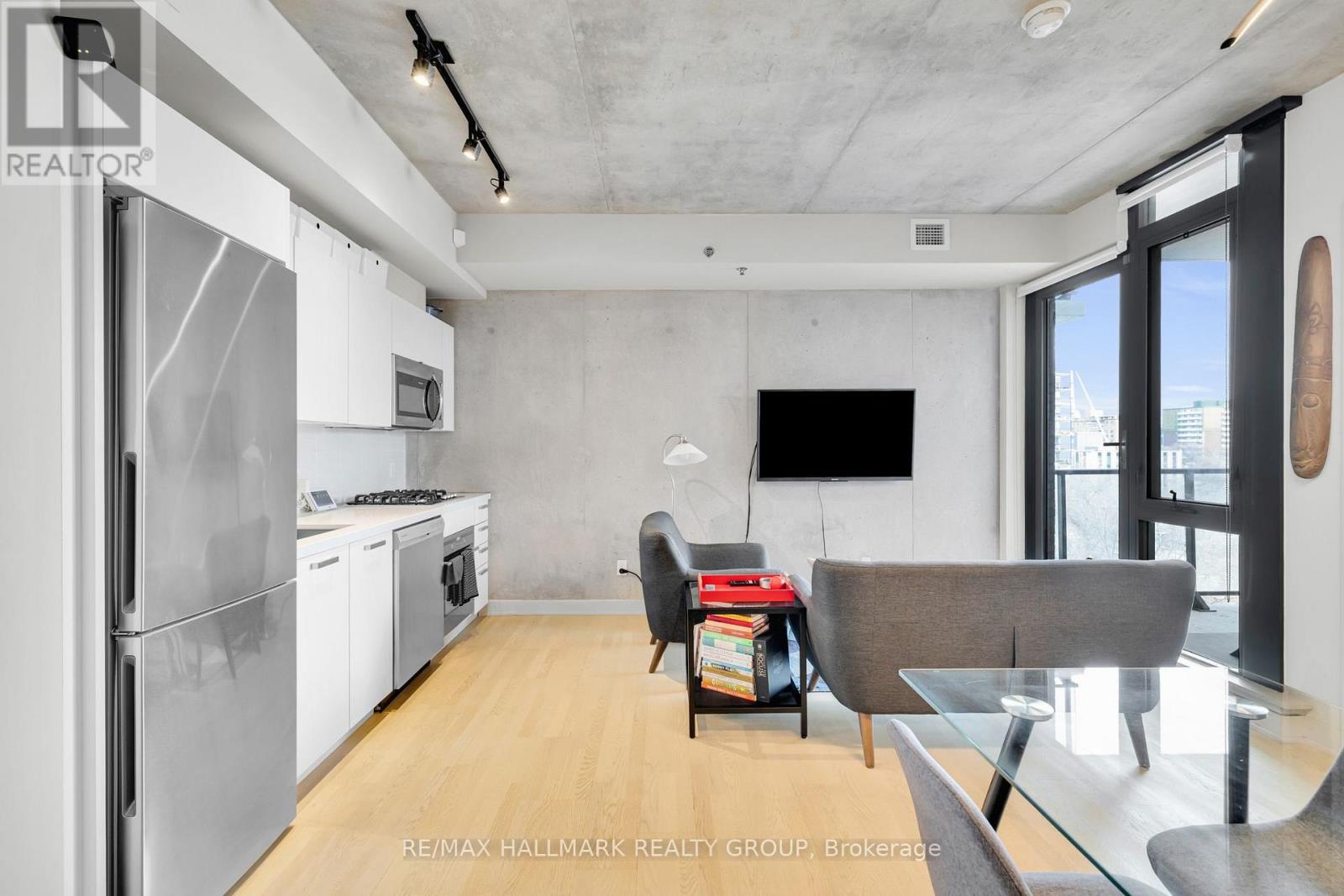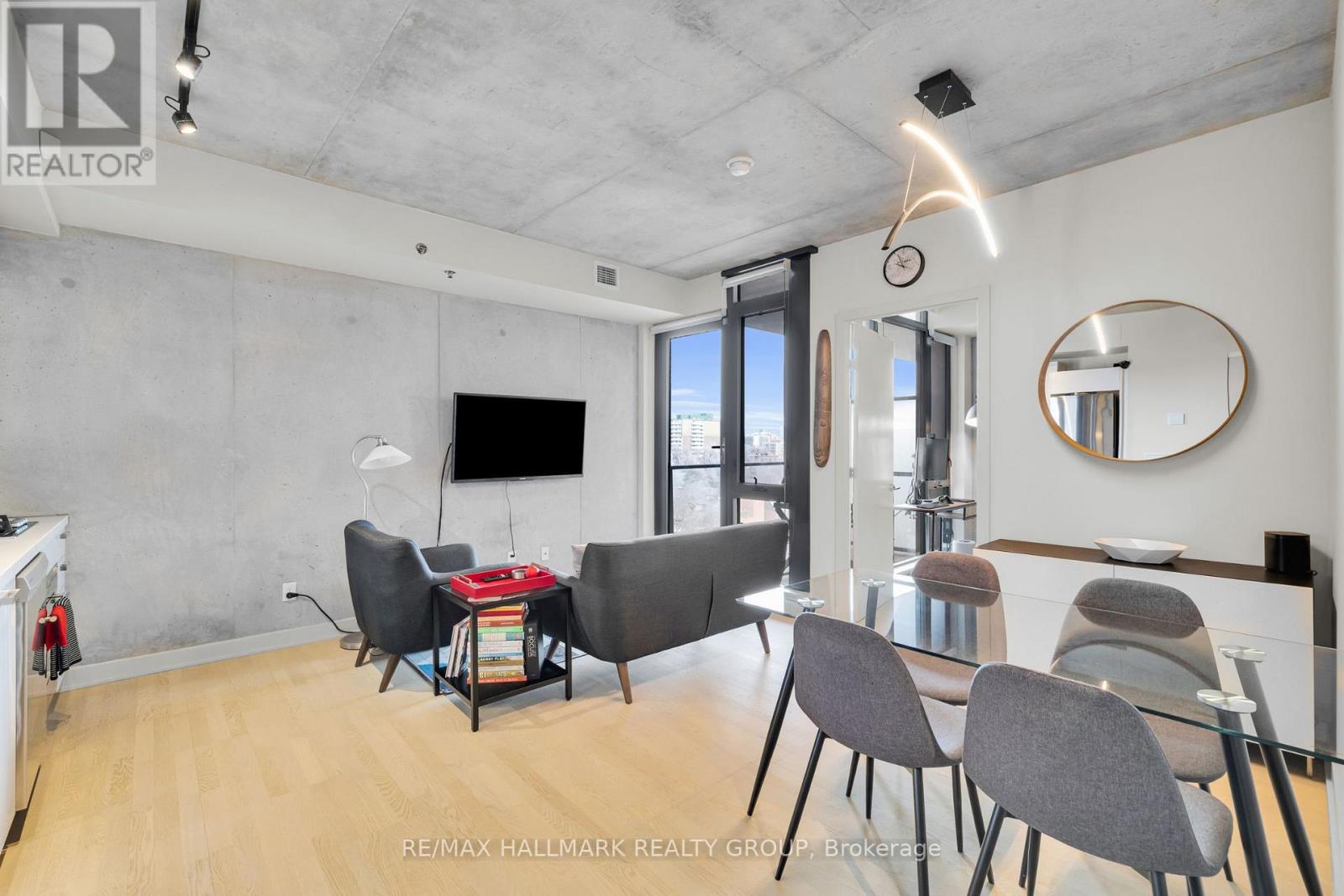 Modern 1-bedroom condo with parking and storage locker in the iconic SOBA building in Centretown, featuring floor-to-ceiling windows, exposed concrete ceilings and walls, sleek contemporary finishes, and access to luxury amenities including an outdoor pool and concierge, all steps from Bank Street, Lansdowne, and the Rideau Canal.This bright open-concept unit showcases the modern industrial design SOBA is known for, with expansive windows that fill the space with natural light and highlight the clean architectural lines throughout. The stylish kitchen features stone countertops, stainless steel appliances, and modern cabinetry, flowing seamlessly into the living and dining area for comfortable everyday living or entertaining.The bedroom provides generous storage and privacy within the smart urban layout. Enjoy the convenience of in-unit laundry, and a private balcony, perfect for relaxing in the heart of downtown.Residents enjoy premium building amenities including concierge service, a fully equipped gym, pool and terrace, spa pool, and sky garden party room.Located at the corner of Catherine and Bank, this unbeatable location places you steps from Ottawa's best restaurants, cafés, shops, Lansdowne Park, and scenic Rideau Canal pathways, with quick access to Highway 417 and excellent transit connections.An outstanding opportunity for professionals, first-time buyers, or investors seeking modern downtown living in one of Ottawa's most recognizable condo buildings. (id:31145)