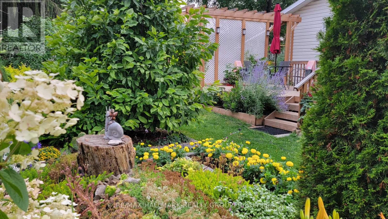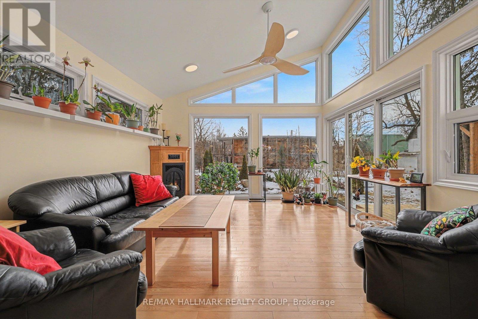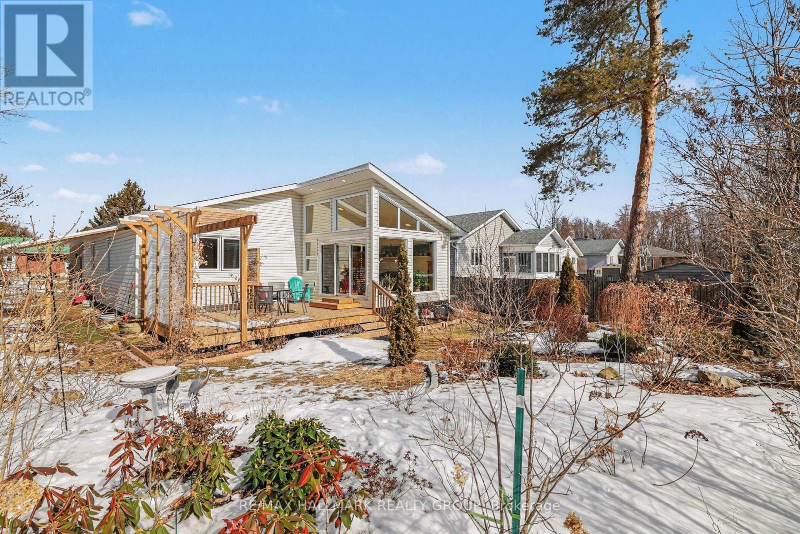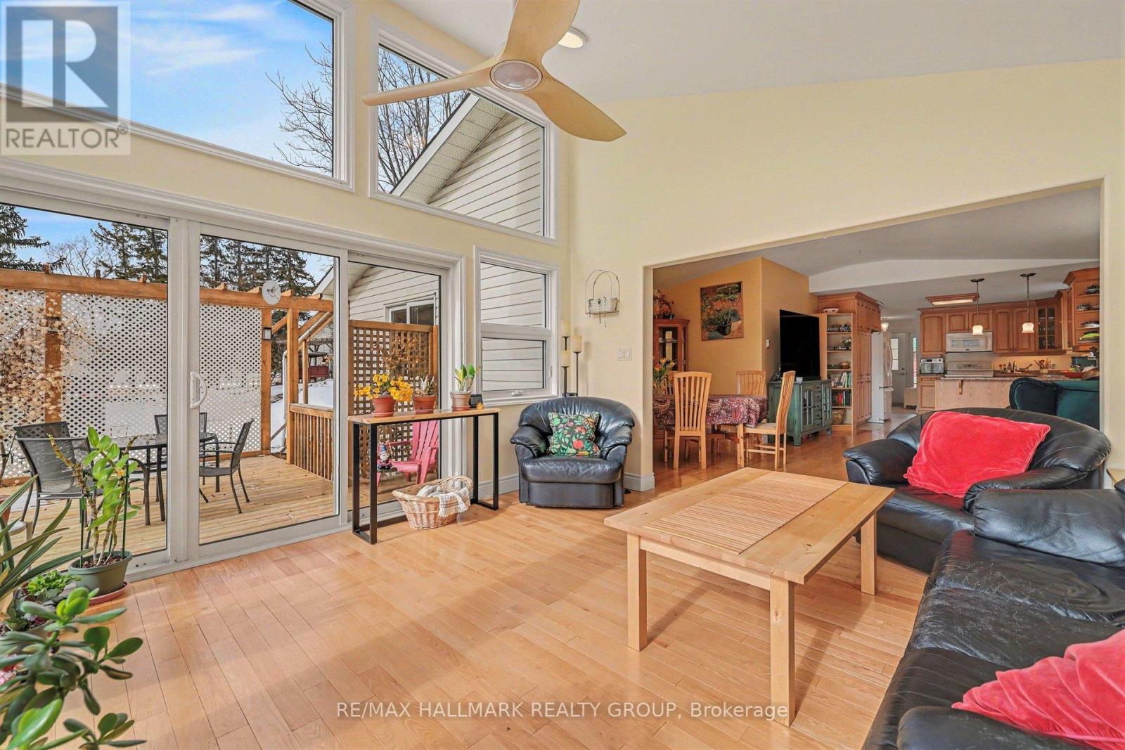 A true gardener's paradise - this bungalow offers comfort, functionality, and charm in a family-friendly neighbourhood. The entrance foyer features tile flooring and convenient inside access to the attached double garage and the main floor office / den overlooking the front yard, providing the perfect space for working from home, a quiet retreat, or an orchid room :) The open-concept main level is thoughtfully designed with seamless sightlines from the kitchen through the living / dining areas and into the stunning family room addition. This sun-filled space is a true highlight, featuring vaulted ceilings, walls of windows, a cozy gas fireplace, and patio doors leading to a private deck-perfect for entertaining or relaxing while enjoying the backyard. The main floor offers two spacious bedrooms, including a large primary suite complete with a walk-in closet and 3-piece ensuite bath. A convenient main floor laundry room adds to the home's practical layout. Downstairs, the partially finished basement provides excellent additional living space with a third bedroom, a rec-room area, a 2-piece bathroom, and ample storage in the utility room. Comfort is ensured year-round with a natural gas furnace, central air conditioning, and radiant in-floor heating in the basement. When you step outside you'll discover a true gardener's paradise. The beautifully landscaped yard is filled with mature plants and vibrant perennials that bloom throughout the seasons, offering an ever-changing backdrop of colour and tranquility. Additional features include a newer roof (2018), on-demand hot water system, and a natural gas BBQ hook-up. Ideally located close to all of Kemptville's amenities, the Waterfront Trail, local cafés, and quick access to the 416, this home offers the perfect blend of small-town charm and commuter convenience. A wonderful opportunity to enjoy comfortable living in a picturesque setting. (id:31145)