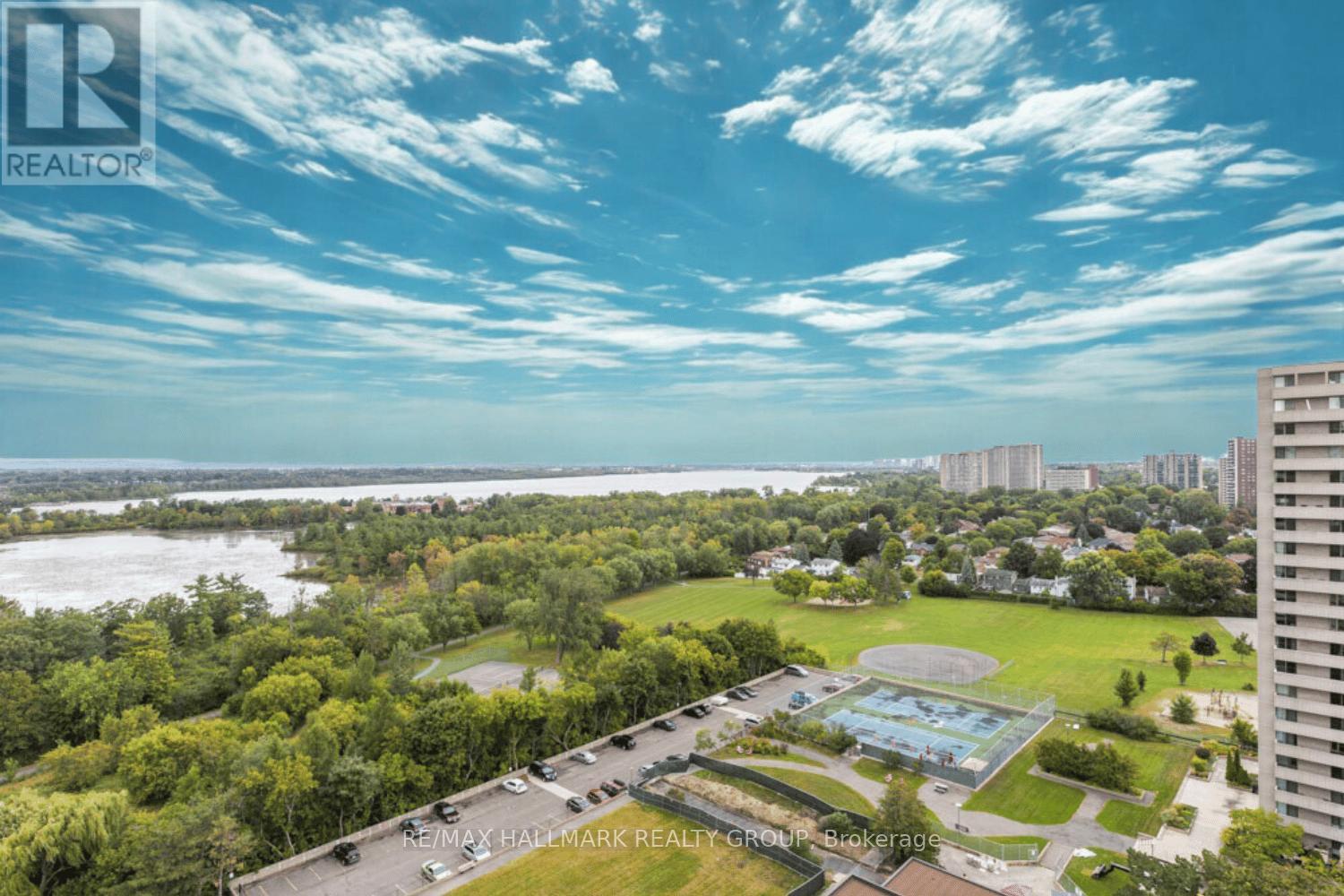 Welcome to 265 Poulin Avenue, Unit 805 where an open layout meets a panoramic view. Step into the unit and you're greeted by a bright foyer w/mirrored sliding doors that keep coats and shoes neatly organized. From here, the home opens into a spacious living&dining area filled w/natural light. Large windows showcase the unobstructed view of the Ottawa River, creating a peaceful backdrop that changes beautifully w/each season. The open layout gives you freedom to arrange your space however you like cozy reading corner, dining by the window, or an open entertaining setup. Step through the patio doors to your private balcony, an ideal spot to unwind after a long day or simply take in the views of lush treetops and the water beyond. The kitchen is designed for both function and comfort. Bright white cabinets offer generous storage & ample space makes meal preparation enjoyable. Tile flooring adds a clean touch in the kitchen & transitions seamlessly into warm hardwood floors that flow through the main living areas & bedroom. The bedroom is bright & spacious, filled w/natural light. A large wardrobe w/sliding doors provides plenty of organized storage. A modern bath completes the layout, featuring clean white finishes & excellent cabinet space. An in-unit storage room adds extra convenience, perfect for pantry items or seasonal belongings. The unit also includes 1 underground parking spot as a bonus during Ottawa's winter. You'll enjoy access to fantastic building amenities including an indoor pool, sauna, fitness room, party room, library, pool table, laundry facilities, and outdoor tennis courts. Outside, you're steps from Mud Lake, Britannia Beach, and the scenic walking & biking trails along the river. Beachconers Ice Cream Shop is just down the street, and schools, grocery stores, restaurants, and Bayshore Shopping Mall are all nearby. Perfect for anyone seeking comfort, convenience, and a relaxed lifestyle with a view, this condo truly offers it all. (id:31145)