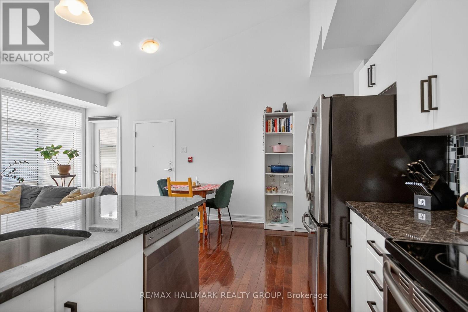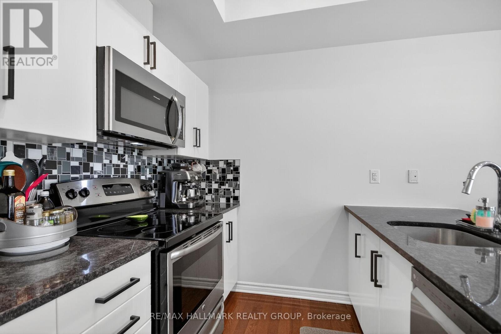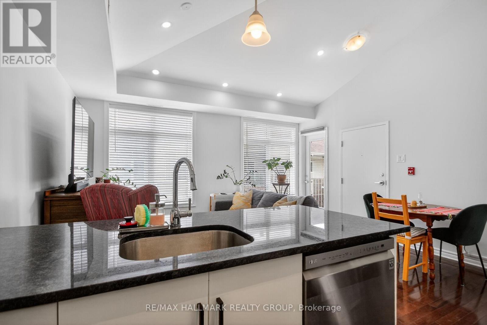 $396.64 MonthlyFabulous open concept top floor condominium with two bedrooms and two bathrooms. Spacious and bright great room with amazing cathedral ceilings, pot lighting and picture windows. The gourmet kitchen features stunning granite countertops, glass backsplash, breakfast bar and stainless steel appliances. The primary bedroom suite includes a walk in closet and a beautifully appointed ensuite bathroom with an oversized glass enclosed shower, granite countertops and ceramic flooring. Generous secondary bedroom. Main bathroom with ceramic flooring and granite countertop. Hardwood and ceramic flooring throughout. Private balcony off great room, perfect for morning coffee or evening relaxation. Well located in the popular Elmvale Acres neighbourhood and in close proximity to the Trainyards shopping centre, St. Laurent shopping centre, Cheo, the General Hospital, parks, walking trails, public transit and just minutes to downtown and Hwy 417. 24 hour irrevocable on offers. (id:31145)